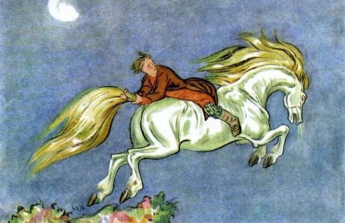 Теперь рассмотрим сюжет всем известной сказки о Коньке-Горбунке, в которой повествуется о Полёте, который обошёлся без инверсивных неудач, но который также связан с темой преодоления Ветхого-в-Царском.