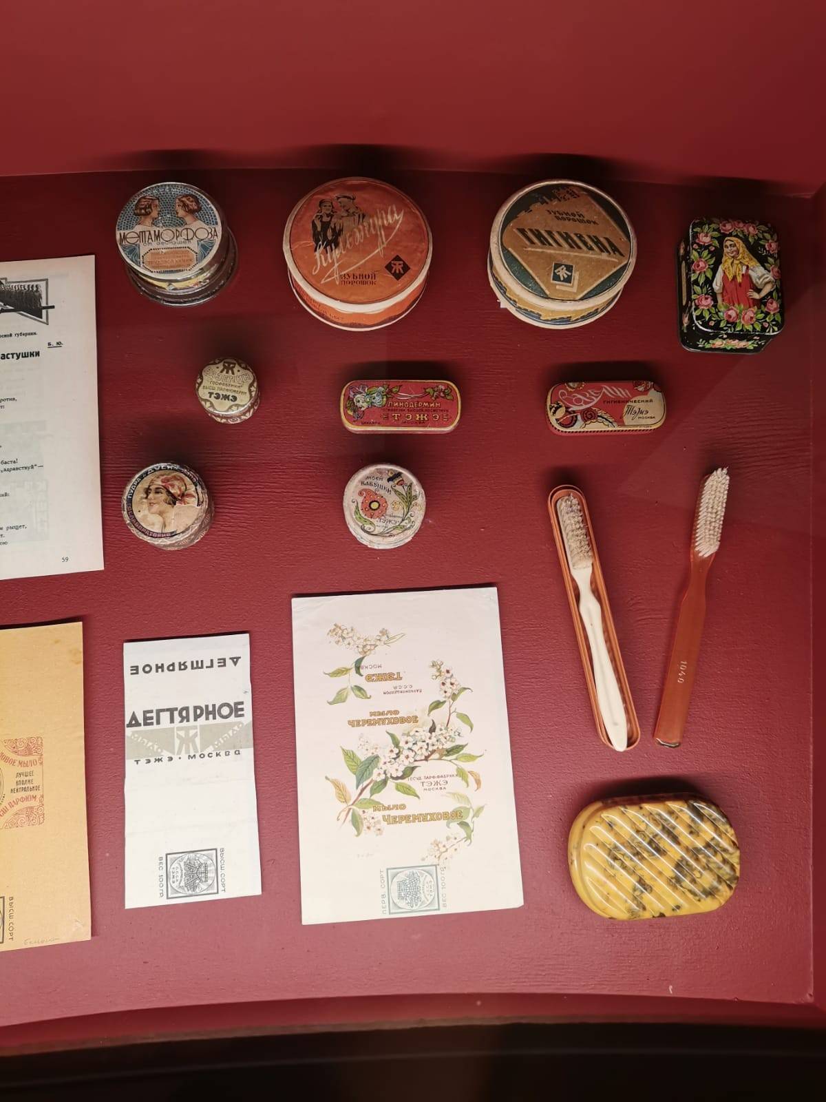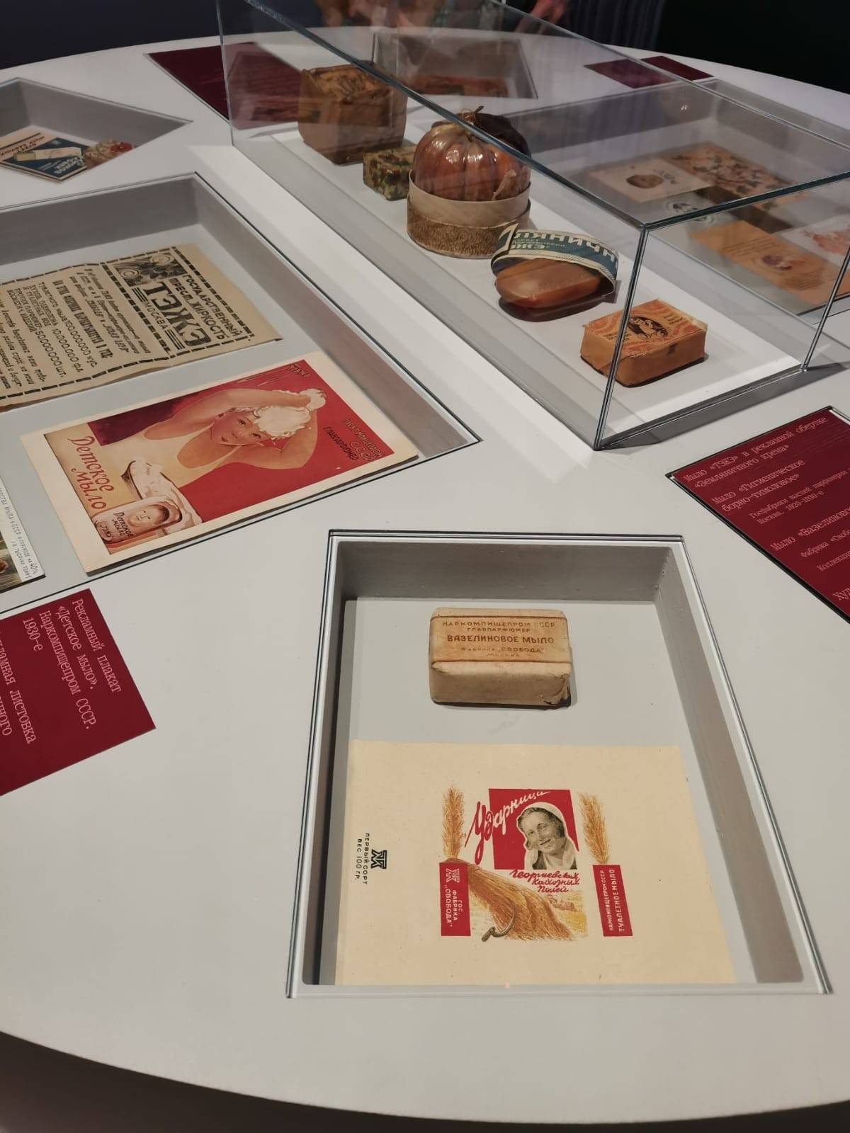 Сейчас покажется диким, но к тонкому мылу и зубному порошку надо было ещё и приучать. Большинство крестьянско-пролетарского населения обходилось еженедельной баней и самым простым мылом – без отдушек. Советская власть в лице своих культуртрегеров буквально заставляла людей мыться на постоянной основе, а не лишь раз в неделю. На производствах и в домах нового типа был обязательный душ. В детских садах воспитатели следили за тем, чтобы дети чистили зубы. В школах проверяли руки и шею. Беспризорников насильно отмывали и уже потом устраивали им путёвку в жизнь. Боролись с вшами, клопами да блохами. Неслучайно возник «Мойдодыр» Корнея Чуковского, где против мальчика-грязнули ведутся настоящие бои. Среди экспонатов – не только баночки из-под порошков и одеколонные флаконы – тут презабавная инсталляция из кусков розового мыла.