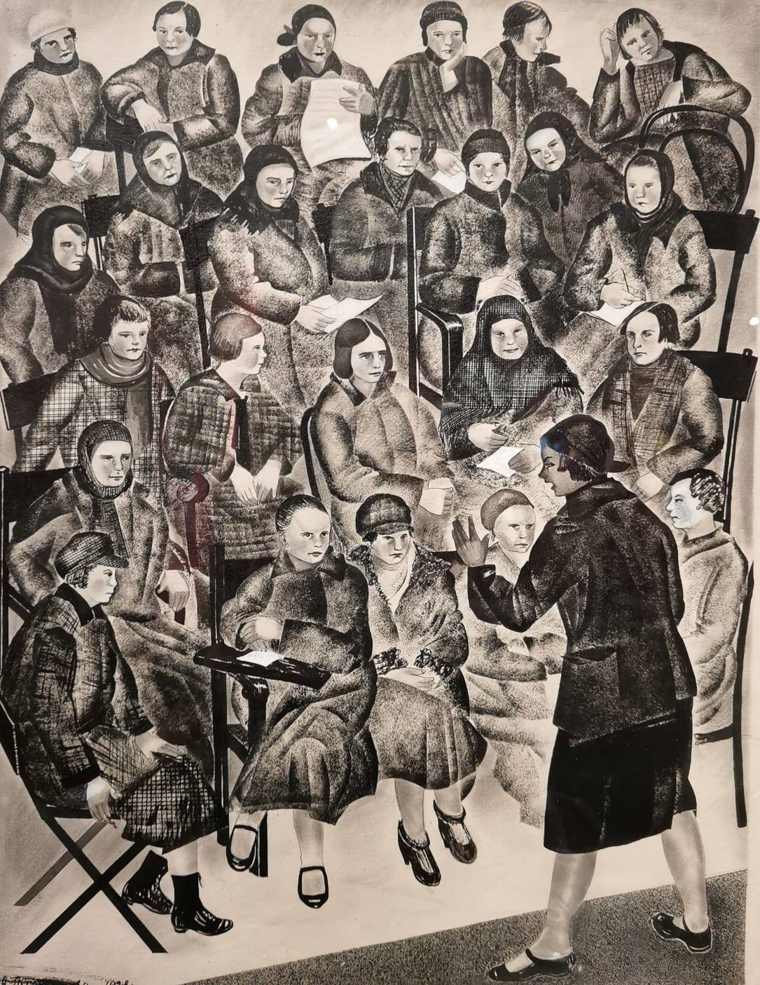 Авторы экспозиции явили всю палитру 1920-х. Вот – яростные «Трубы» Сергея Лучишкина, где стройные ряды комсомольцев маршируют в блистающее послезавтра. А тут – «Банный хвост» Александра Вахрамеева. Очередь в баню. Поистине зощенковский сюжет о том, как «помывка сознательного пролетария» сопряжена с многочисленными трудностями. Тут показаны все слои населения – и конторские барышни, и мобилизованный красноармеец, и господа «из бывших», донашивающие свои элегантные пальто. «Собрание текстильщиц» Александры Платуновой – это гимн советскому равноправию. Отныне женщина сама решает, как ей поступать – на работе, в быту и любви. СССР признал право «слабого пола» на сильные поступки. Уже не муж и не отец определял место под солнцем. На фотографиях – стирка на коммунальной кухне, обед в столовой, физзарядка в детском саду (ясли и детсады активно продвигались в массы, чтобы матери включались в трудовой процесс). Динамичное и жёсткое время! Устремлённость к новым горизонтам. На выставочных стендах – афиши фильмов «Девушка с коробкой» и «Третья Мещанская». Золотое время советских постеров, когда братья Стенберги, друзья Владимира Маяковского, обслуживали киноиндустрию.