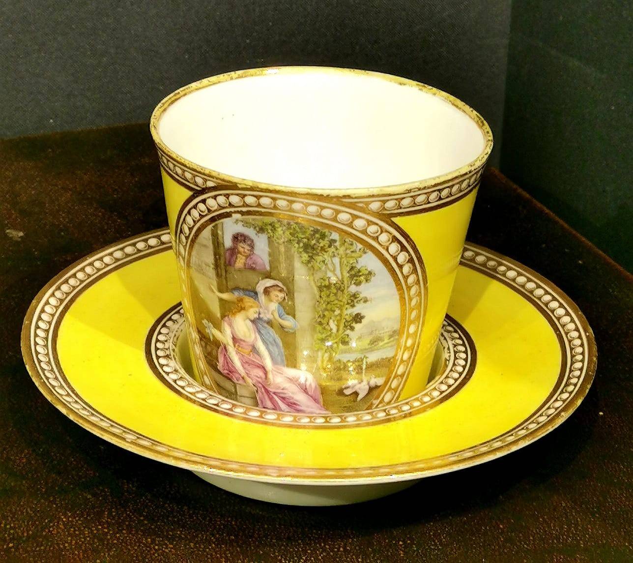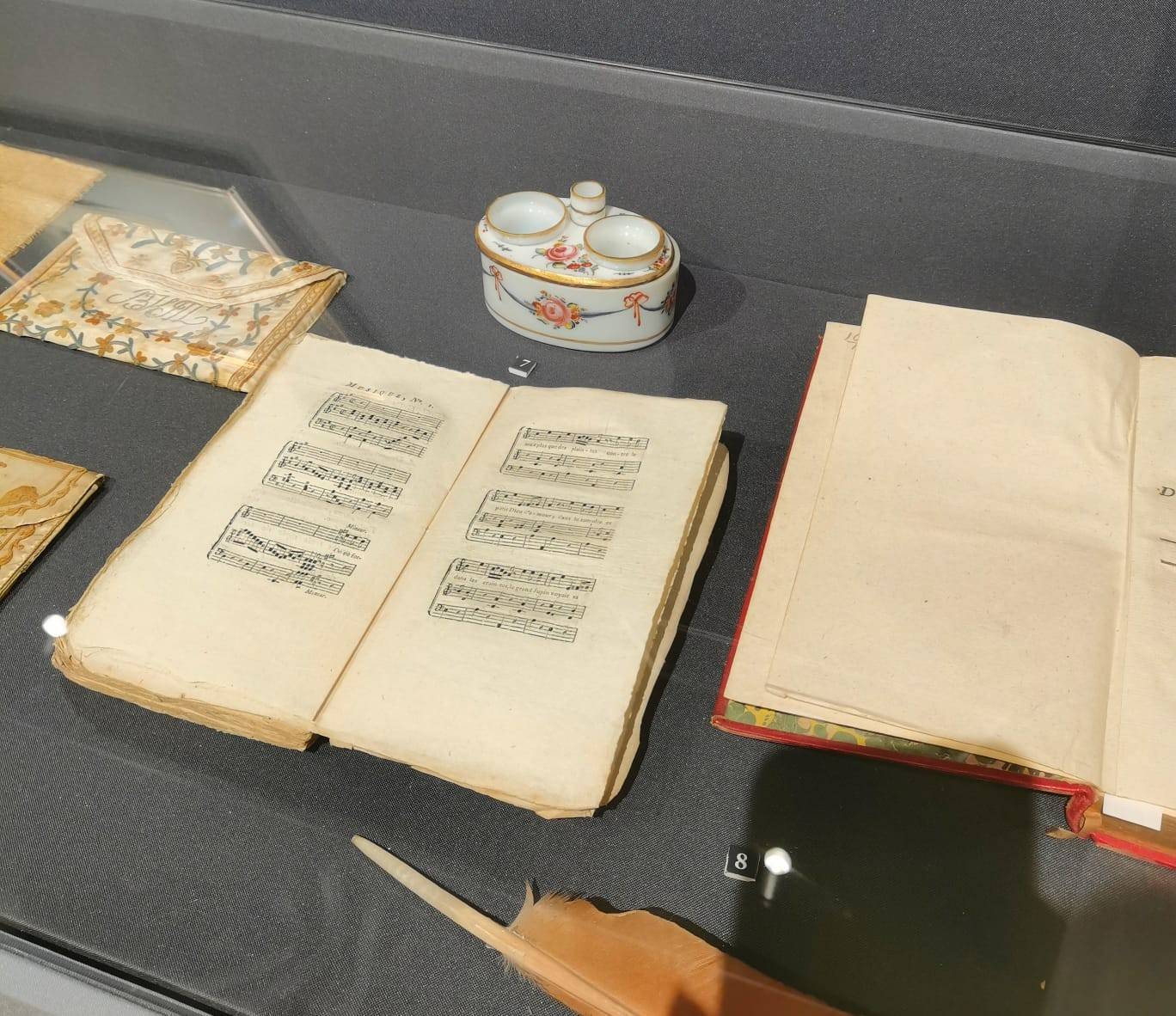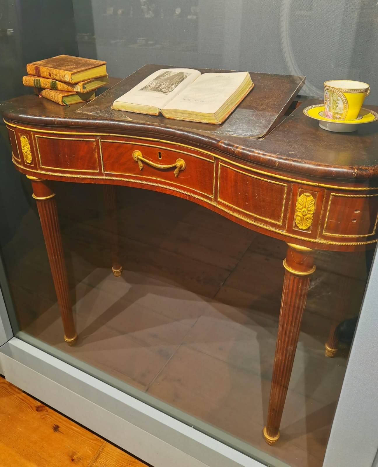 На маленьком столе горкой лежат книги – сочинения Вольтера, Сумарокова, Тассо и Шекспира, а ещё – ноты. Игра на клавесине и пение также входило в образовательный курс. Тут же стоит очаровательная чашка, привезённая из Англии. Во второй половине XVIII столетия в России, как и в остальной Европе, затеялась англомания, потому-то британские изделия охотно приобретали в тех странах, где имелось своё фарфоровое производство. Далее мы видим сервиз Мейсенской мануфактуры с росписью на сюжеты картин Ангелики Кауфман – знаменитой художницы, принятой сразу в несколько Академий.