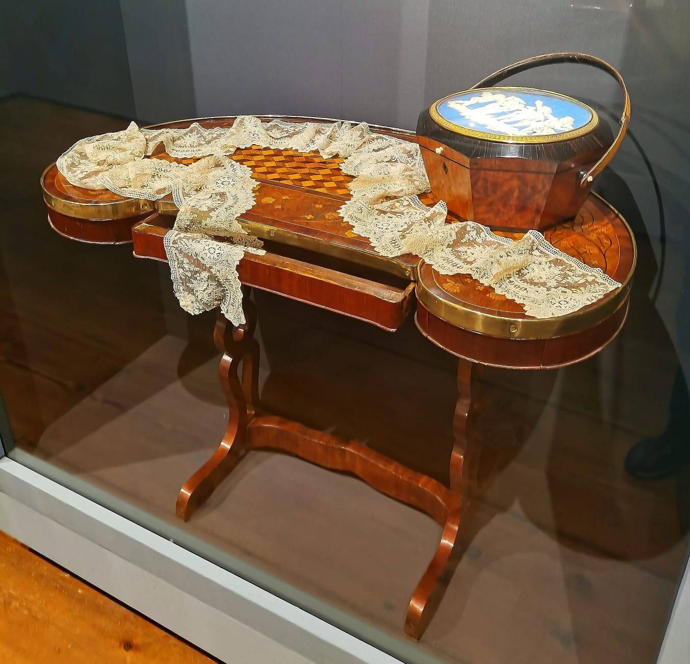 Меблировка XVIII века была затейливо-многообразной. Для каждого занятия существовал отдельный вид стола – для рукоделий, чтения, карточной игры. Снискали популярность крохотные столики «дежене» от французского déjeuner – завтракать или, например, для чая в одиночестве и – чая вдвоём. Так, среди экспонатов - чайный столик на одного человека. Изумляла и конфигурация, вроде столешниц в форме бобового зерна. В России эти столы нежно именовали «бобиками». Они сделались актуальными на волне рококо, не терпевшего прямых углов, а линия бобового зёрнышка прекрасно вписывалась в эстетику рокайлей.