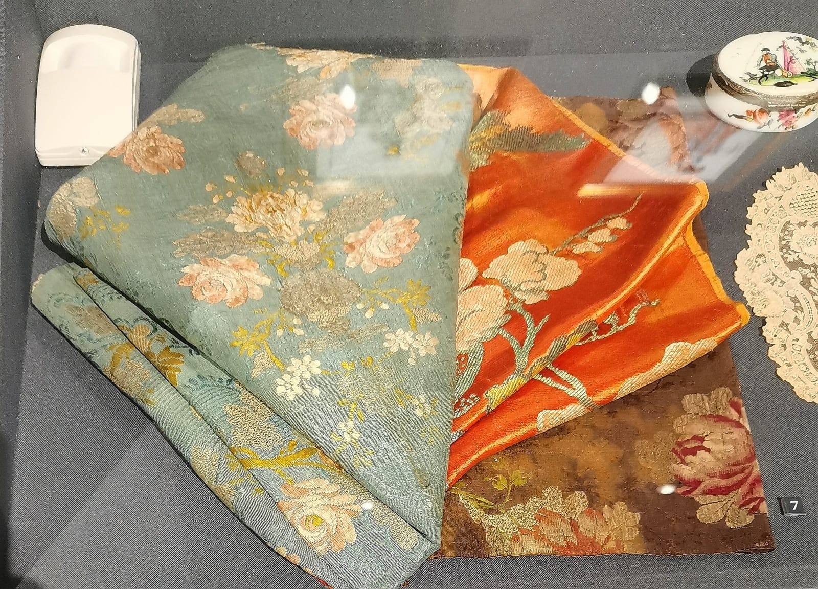 Рядом со шкатулкой лежит великолепнейшее кружево – плетение было обязанностью крестьянок, а хозяйские дочери не знали коклюшек. Это – брюссельское кружево, но и русские мастерицы имели успех. Каждый помещик стремился обзавестись своими «домашними» кружевницами. На следующей витрине – игольники, напёрстки, коробочки для ниток, бисер, челночки. А тут – вышитые кошельки. Тут же – образцы тканей. Графские жёны и дочери, конечно, сами не шили себе нарядов, но могли проявить фантазию в разработке модного фасона.
