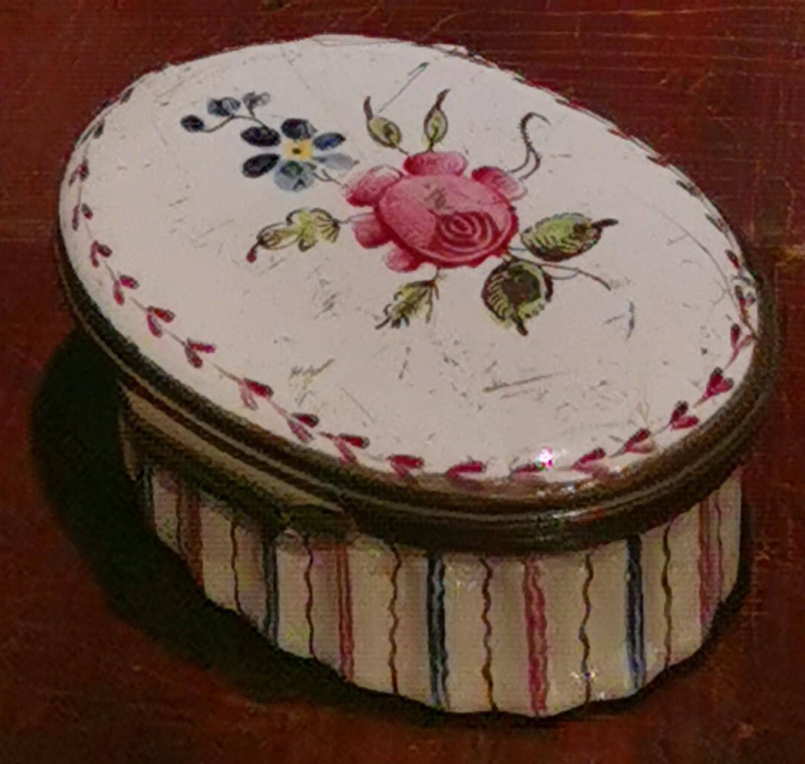 Тут же – мушечница, не менее существенный предмет галантного времяпровождения. Тафтяные или бархатные кружочки, смазанные клеем - непреложная деталь макияжа. Их клеили, чтобы оттенить белизну кожи. Если в начале столетия мушки беспорядочно лепили – ради приобщения к европейской моде, то затем дамы вызубрили «язык мушек» - он был дополнением к «языку веера». При помощи системы знаков аристократки общались со своими воздыхателями: положение мушки на лице соответствовало настроению.