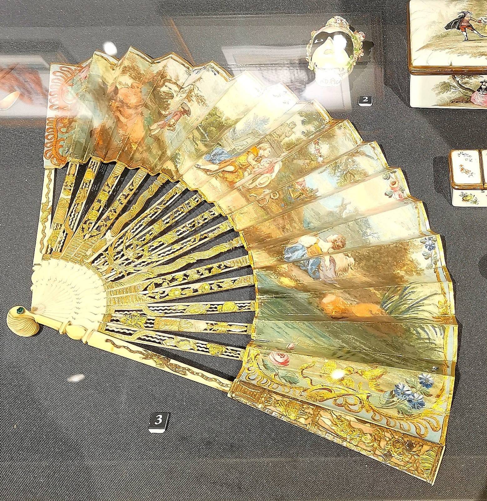 А вот – роскошный веер, сотворённый в Париже. Веера входили в число статусных вещей – умение изысканно поигрывать опахалом было непременным пунктом в вырабатывании светских манер. Знаменитой мадам де Сталь приписывается фраза: «По манере пользоваться веером я легко могу отличить княгиню от графини и маркизу от разночинки».
