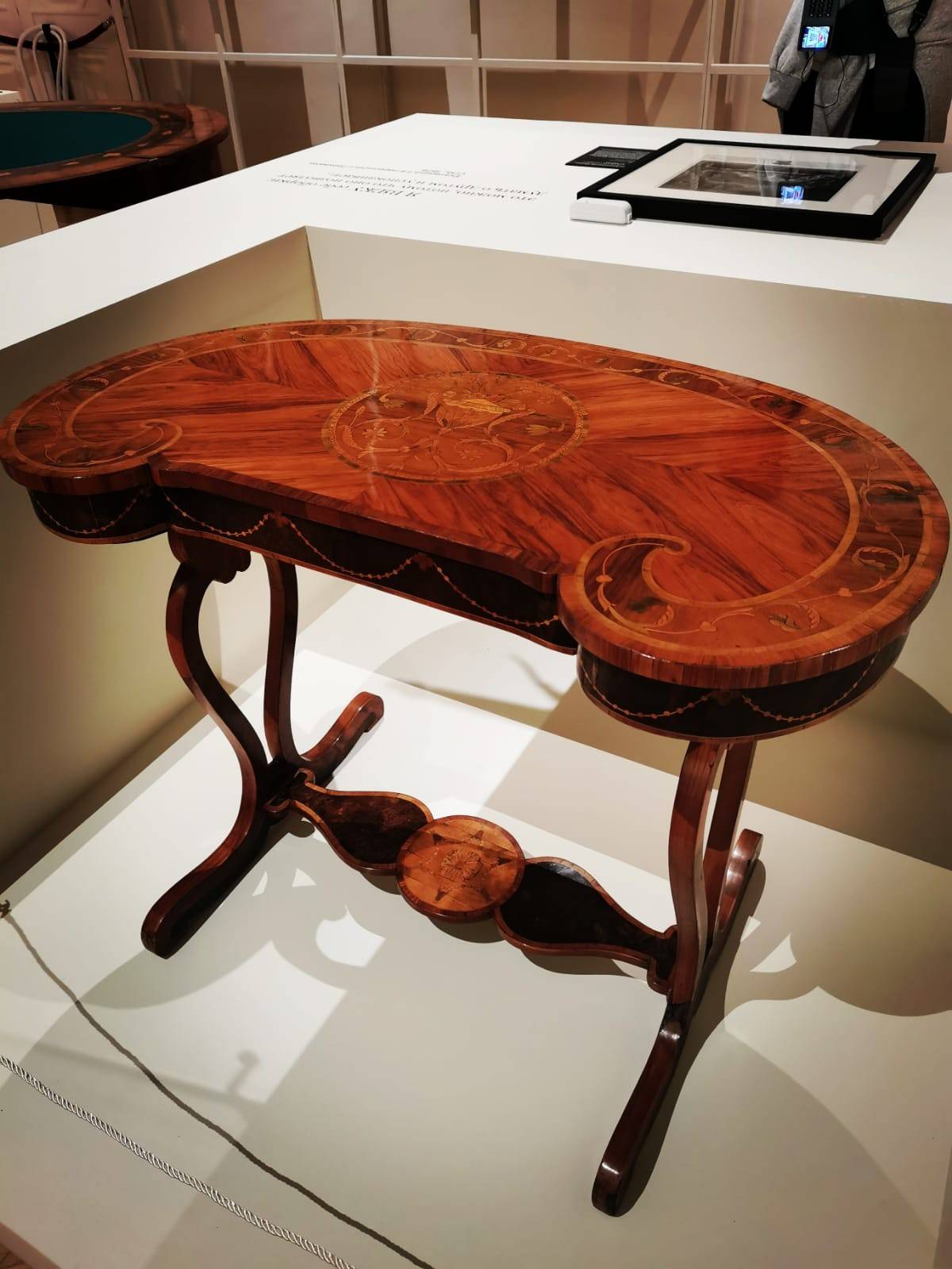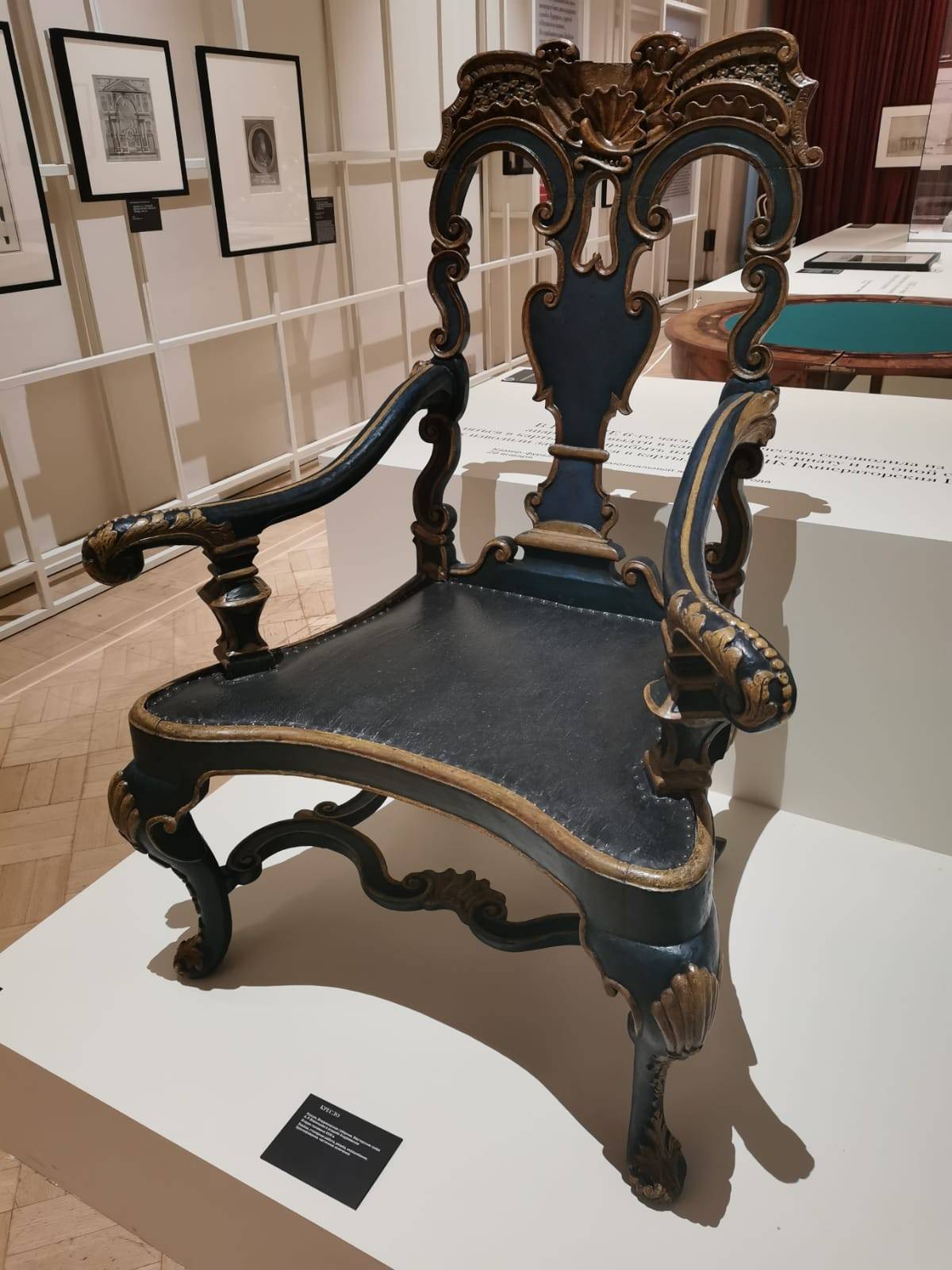 Находила Екатерина часик-другой и для карточных игр – до них она большой охотницей. В юности игрывала по-крупному, а став самодержицей, умеряла свой пыл. Перед нами – игральные карты XVIII века и круглый ломберный стол. За такими столами резались не лишь в ломбер, но и в макао, фараон и преферанс, а провинциальные баре и в подкидного дурака не брезговали, однако, название дал именно ломбер, получивший распространение при Екатерине II. Из мебели представлен изогнутый столик-бобик со столешницей в форме бобового зерна. Бобики стали модны в середине ХVIII столетия, когда царило рококо, не терпевшее прямых углов, а линия бобового зёрнышка прекрасно вписывалась в капризную эстетику рокайлей.