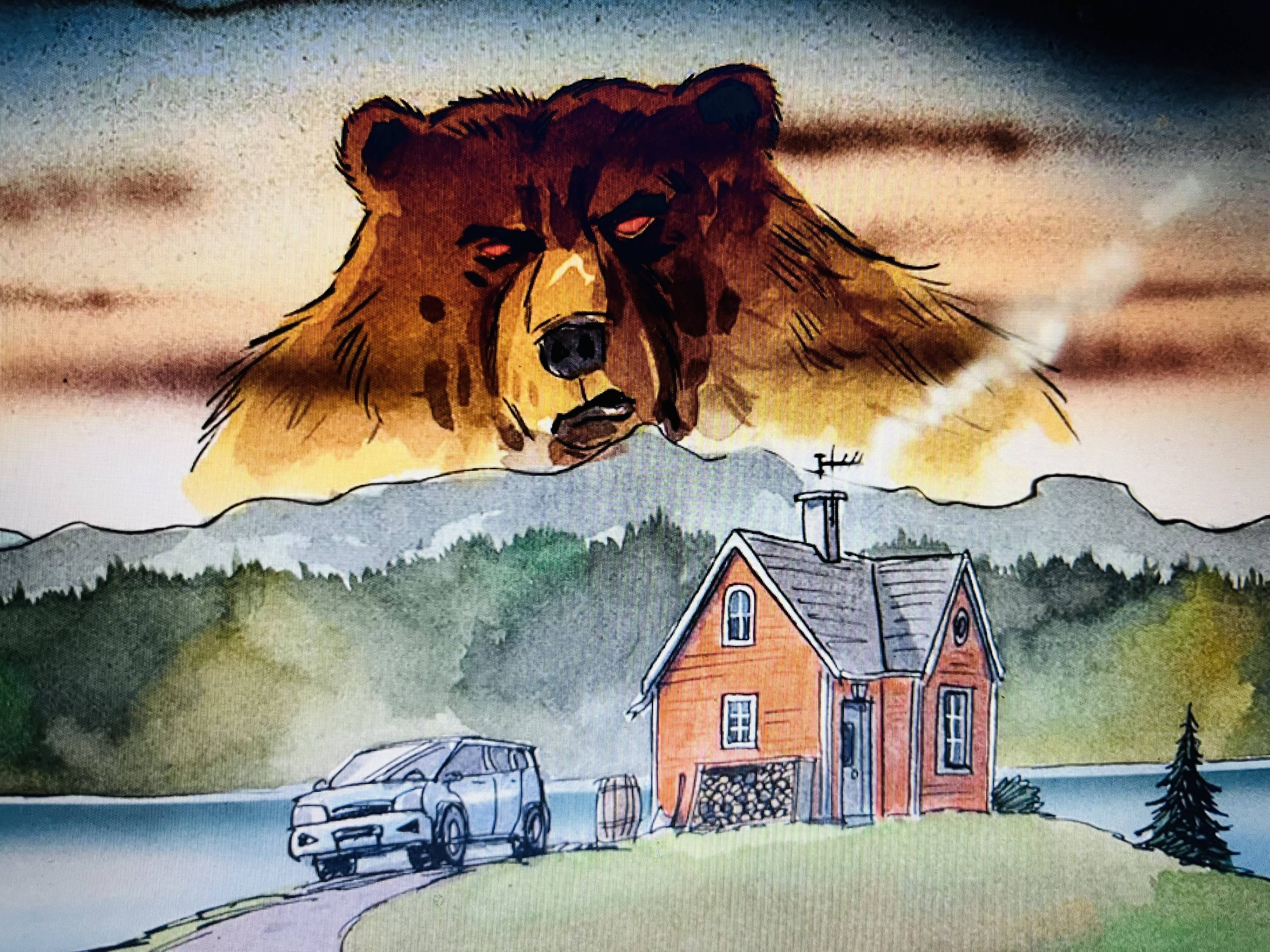 На иллюстрации к статье в «Экономисте» изображен уютный европейский дом у озера с припаркованной на извилистой тропинке машиной. На заднем плане изображены горы и леса. Над этой картинкой в небе угрожающе возвышается гигантская голова медведя (ясно, что русского – В.О.) с горящими красными глазами.