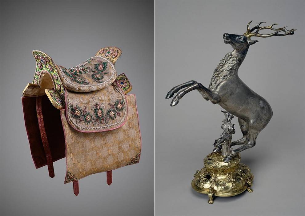 Сюда же относится масштабное полотно Александра Литовченко «Иван Грозный показывает сокровища английскому послу Горсею», где изображён выразительный арчак (остов седла) второй половины XVII века, да и прочие артефакты сомнительны с исторической точки зрения. Арчак представлен тут же, на одной из экспозиционных витрин. Рядом – настольное украшение «Олень» гамбургского производства 1630-1640-х годов, кубок-наутилус 1620-х годов, блюда, сосуды, элементы упряжи – все, созданные в XVII столетии, но их явил художник в числе сокровищ Иоанна.