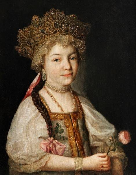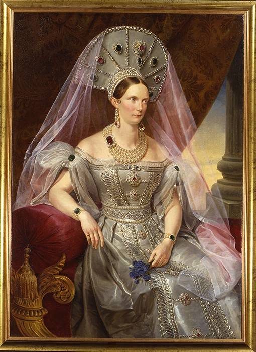 «Легенды Кремля» – продолжение темы, но уже со славянским уклоном, и мы наблюдаем портрет Шарлотты-Александры в полусказочном русском облачении: высоченный кокошник, фата, каменья, громоздкое ожерелье. Мода на допетровский шик возникла ещё на излёте Галантного века, при Екатерине Великой. На выставке можно увидеть портрет царевны Александры Павловны, дочери Павла I в русском костюме - парчовый сарафан, коса, венец. Те убранства до 1830-х были не обязательны, имея характер сентиментально-патриотической моды. Их отрегламентировал и ввел в придворный быт лишь Николай I.