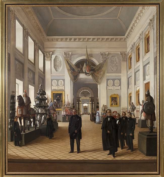Экспозицию венчает живописный холст, рассказывающий о самой Оружейной палате, которая в далёком 1806 году получила статус музея. Картина «Залы Оружейной палаты в Кремле с групповым портретом сотрудников музея» написана художником Николаем Бурдиным в 1846 году по заказу Николая I. В центре композиции - тот самый писатель, автор бестселлера Михаил Загоскин, получивший должность главы Оружейной палаты.