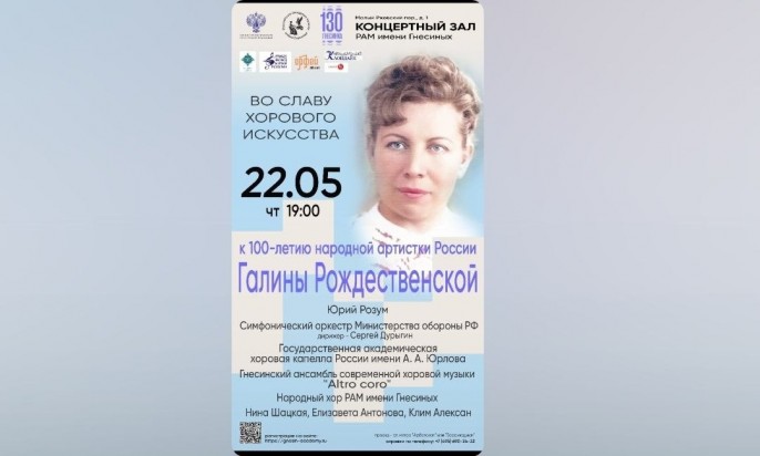 22 мая в 19.00 в Концертном зале РАМ им. Гнесиных Международный благотворительный фонд Юрия Розума открывает фестиваль "Во славу хорового искусства. К 100-летию Народной артистки России Галины Рождественской».