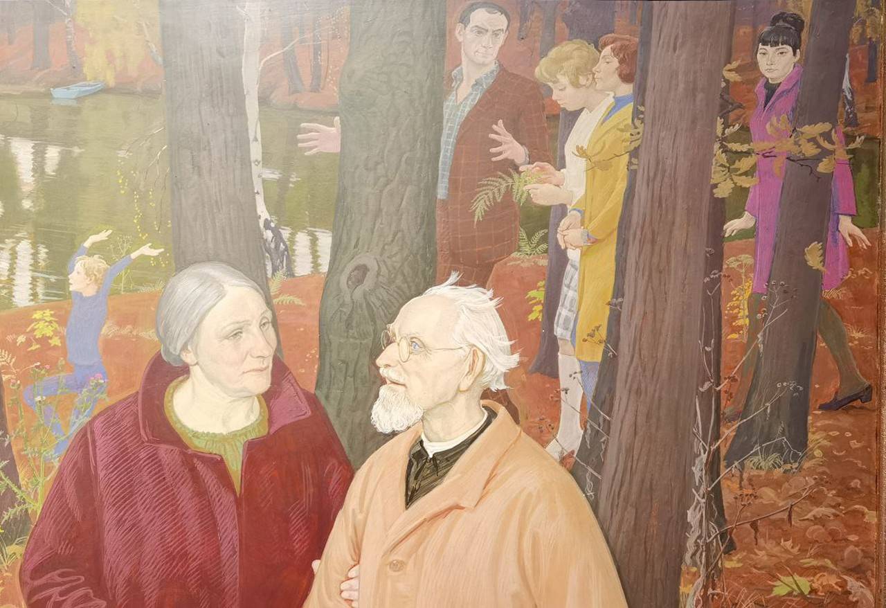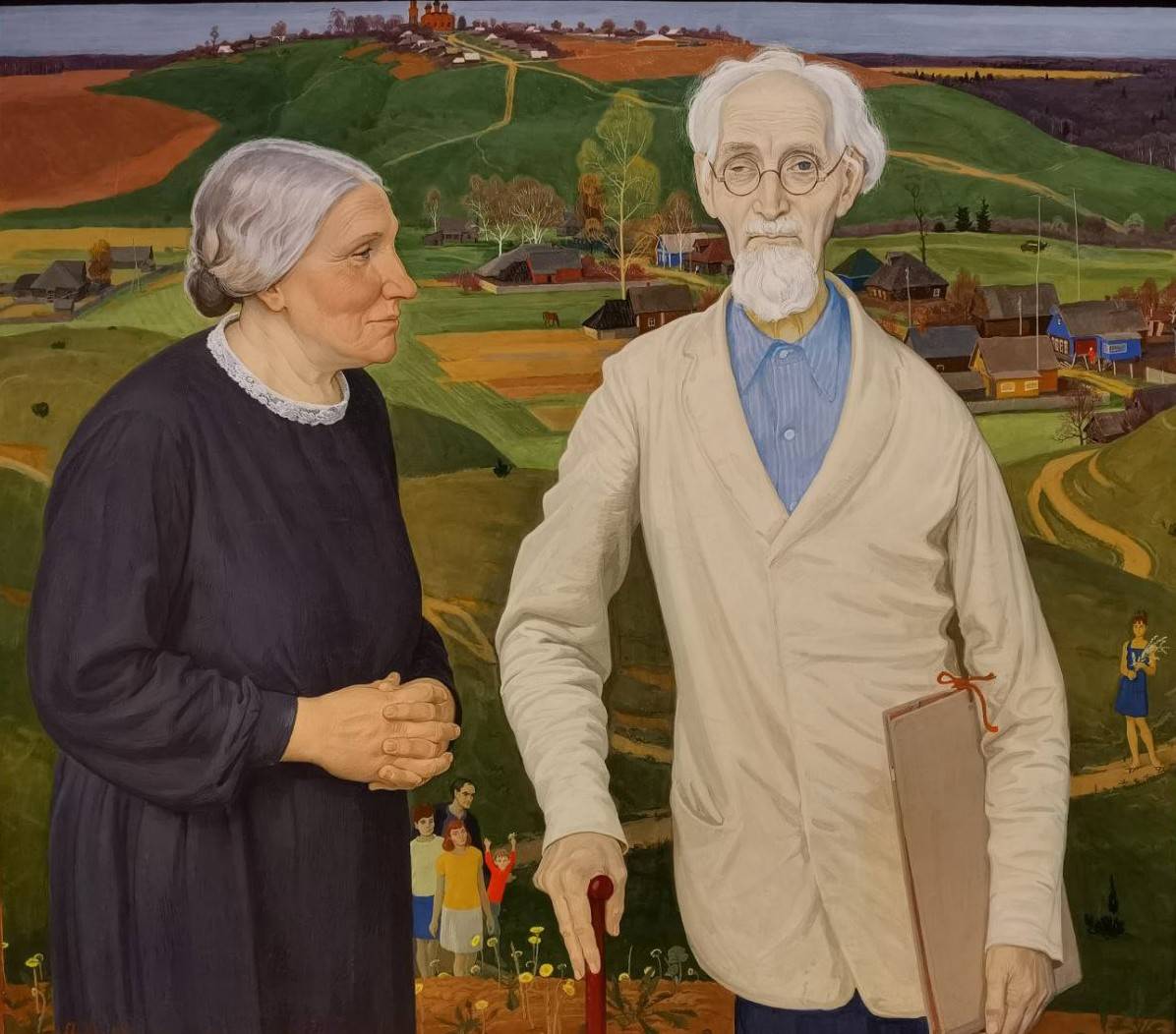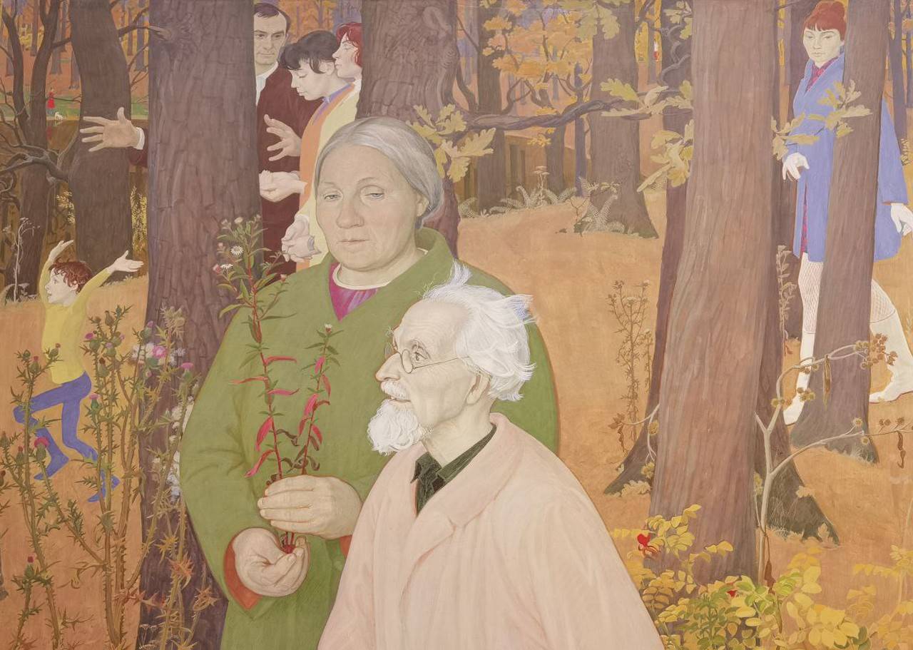Ей посвящена работа «Под старой яблоней». Мы попадаем в сумеречное, уходящее вдаль, пространство сада. Пожилая женщина, босая, с согбенной спиной оперлась о палку. Взгляд погружен внутрь себя, ее лицо бесстрастно. Рядом — собирающие яблоки внуки. В клеймах авторской рамы размещены фигуры отца Дмитрия и брата Василия.