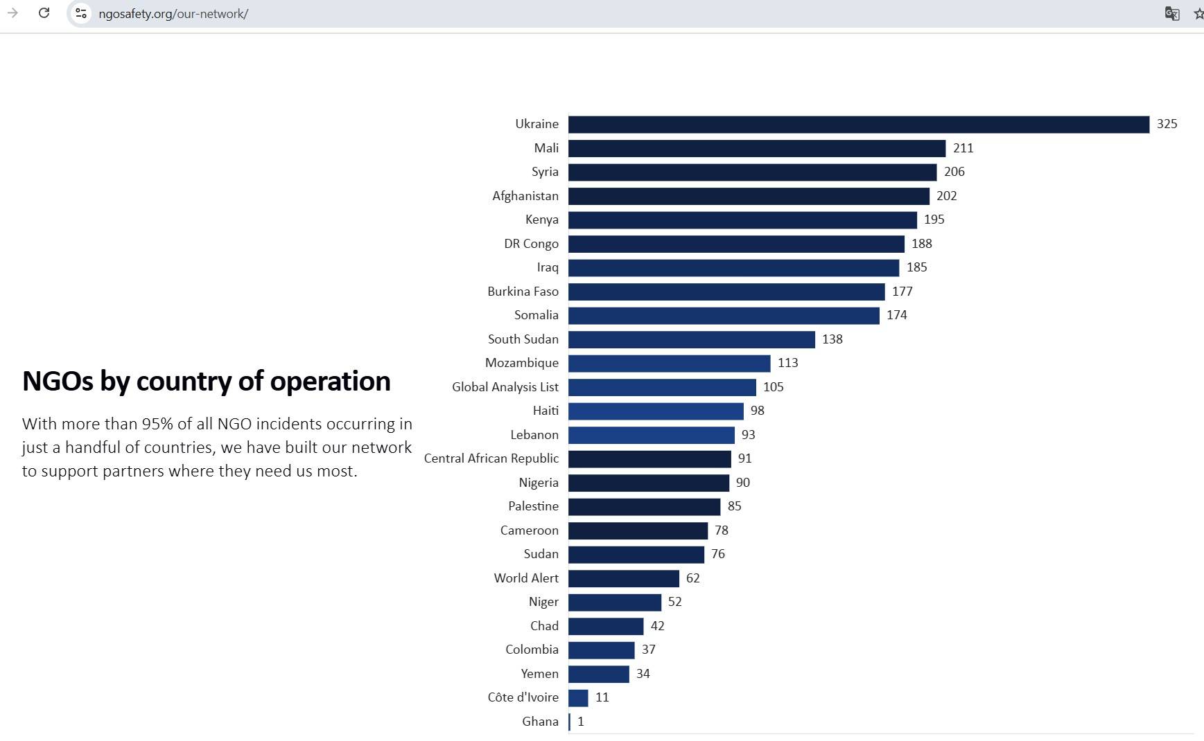 География присутствия этой организации весьма обширна и представлен преимущественно африканскими странами. В качестве иллюстрации ниже приведен скриншот с официального сайта INSO с количеством их представителей в тех самых неспокойных странах мира. Помимо стран Африки (преимущественно южнее Сахары, куда входит и зона российских интересов Сахель), особенно бросаются в глаза «лидеры» по количеству представителей этой НКО на Украине и в Сирии. Стоит добавить, что с апреля 2022 г. на территории Украины действует по такой же схеме и британская частная компания MAG (Mines Advisory Group), занимающаяся вопросами «гуманитарного разминирования» и финансируемая в том числе МИД Нидерландов и Нидерландским фондом помощи беженцам Stichting Vluchteling.