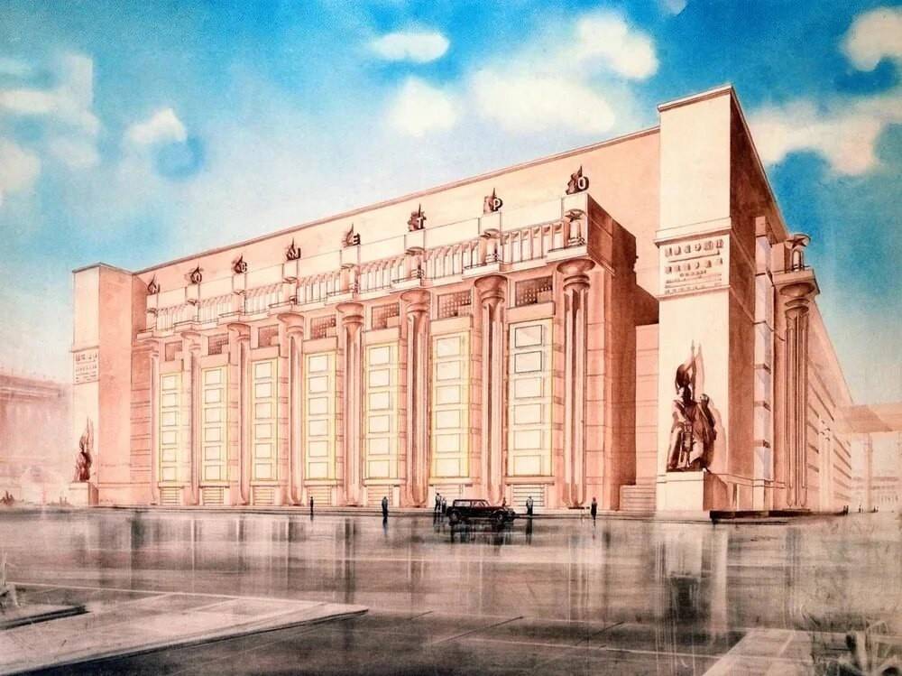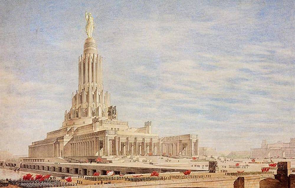 А тут - Вавилонская башня социализма, Дворец Советов. Размах, дерзость, бескомпромиссность – таким был Борис Иофан, победивший в главном конкурсе 1930-х. Ретивая гигантомания – вот синоним тогдашней эстетики. Рассуждалось о Вечности, о том, что и через тысячу лет, в коммунистическом далеко будет выситься этот памятник развитой цивилизации. Но увы или – к счастью, мы так и не увидели многоступенчатый чертог с каменным вождём и мощными залами, через которые могла бы проезжать военная техника. Дворец Советов – сплав стилей. Зодчий хотел воплотить всё то, чему его учили в академиях – и античный ордер, и зиккураты, и классицизм.