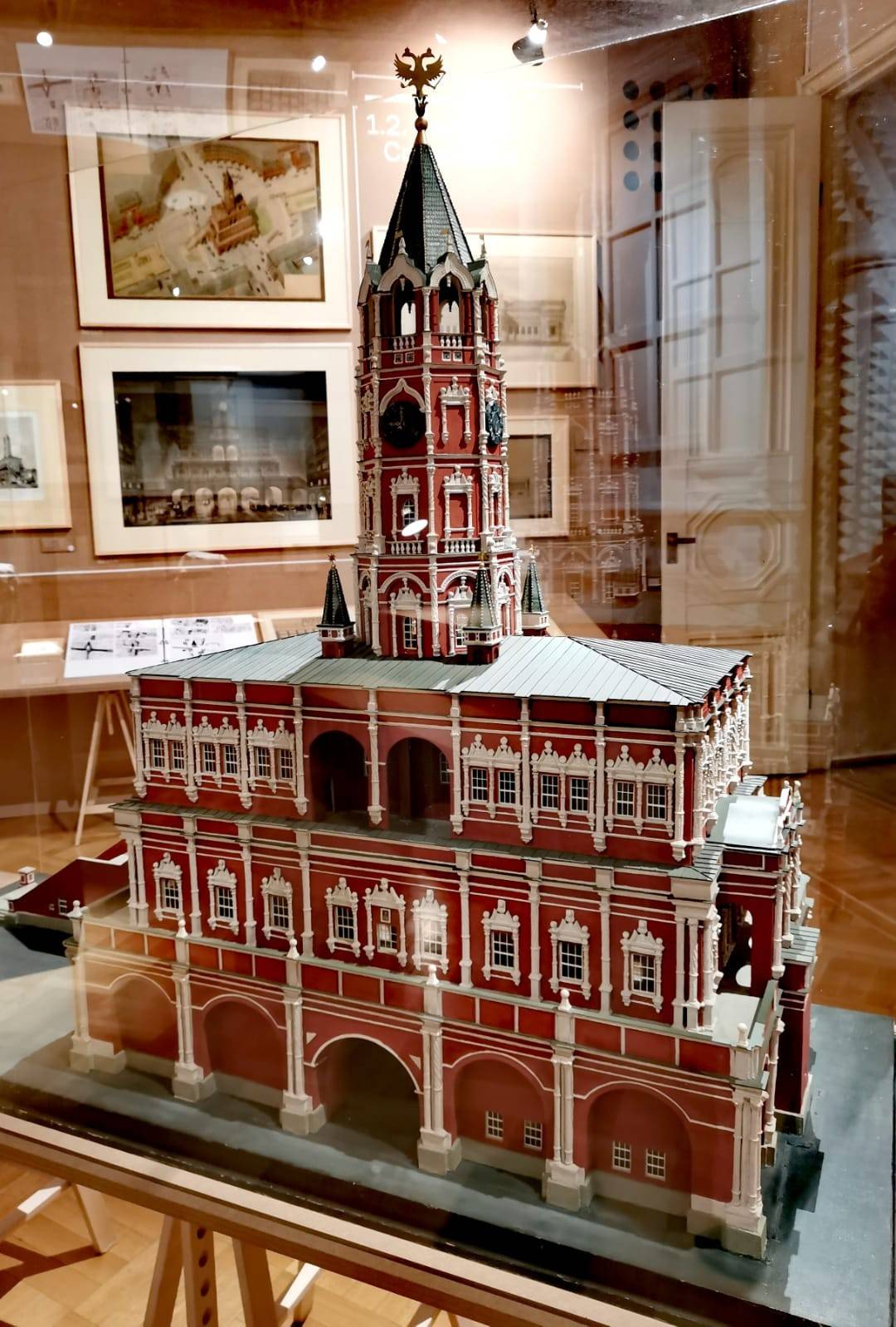 На выставке можно узнать, какие баталии велись в 1920-х – начале 1930-х годов за сохранение Сухаревской махины. Думалось вписать башню в нео-ампирный квартал, а ленинградский зодчий Иван Фомин представил свой вариант – с учётом московского колорита. Но градостроительный диспут пресекли, и с башней распростились. Дескать, она будет мешать движению, да вообще уродлива в своей буйной эклектике. Посреди зала – макет башни, выполненный с невероятным тщанием. Ах, как жаль, что мы когда-то лишились этой удивительной красоты.