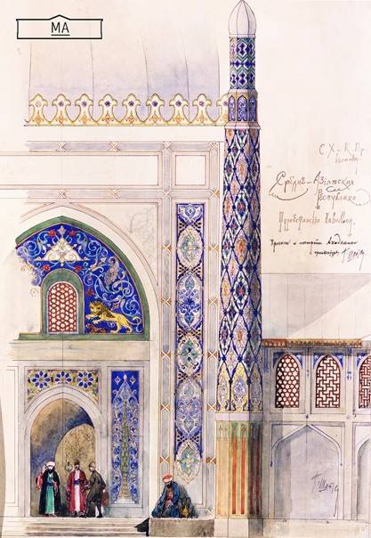 В следующем помещении – штудии, архитектурный рисунок. Любой студент, мечтающий застроить вселенную крутыми шедеврами, долго и упорно учится, и рисование – одна из главных дисциплин. Античные развалины и современные конфигурации – всё это требует остро отточенного карандаша. Но только ли студиозы рисуют архитравы, фризы и карнизы, отмеряя золотое сечение? Хороша акварель Фёдора Шехтеля, изобразившего свой павильон Туркестана, пожалуй, самое восхитительное здание на кустарно-промышленной выставке 1923 года. Пронзительно-яркие цвета востока – Шехтель знал толк в оттенках. Умелый архитектор – ещё и качественный живописец.