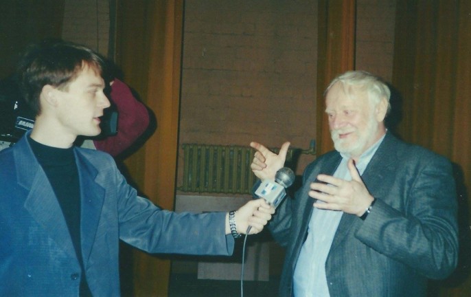 На фото: Александр Марков берёт интервью у Кира Булычёва на конференции "РосКон", 2001 год