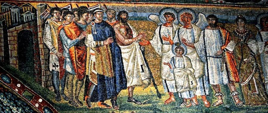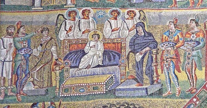 Тот факт, что фигуры волхвов оказались вставлены в уже готовую композицию (они заменили изображения поверженных арианских правителей Равенны; место стыка золотого фона видно невооруженным взглядом), вызвал неожиданный эффект: земное, хотя и сакральное, событие оказалось включено в обстановку Царства Небесного. Первоначально, как мы уже говорили, это была процессия мучеников с одной стороны и мучениц – с другой. Драгоценные венцы мученичества – образ испытанного в горниле страданий золота – несут святые свидетели своему Царю и Богу – Христу и Его Пречистой Матери. То есть, фактически эти люди приносят Им в дар свою земную жизнь, но и награду получают соответственную – жизнь вечную и Царство Божие. И понятно, что вся сцена происходит в райских обителях в вечности (обратим внимание на финиковые пальмы и белые лилии). Не только Христос на противоположной стене изображен здесь как Спас Вседержитель, но и Богородица представлена как Царица Небесная – на престоле и в окружении стражей – Архангелов четырех ветров – сторон света. В упор смотрит и приветствует нас не столько Новорожденный, сколько Предвечный Младенец – Спас Эммануил, восседающий на коленях Матери, как на троне. Такого типа иконы Богородицы с Младенцем позднее получат именование «Всецарица» или «Никопея».