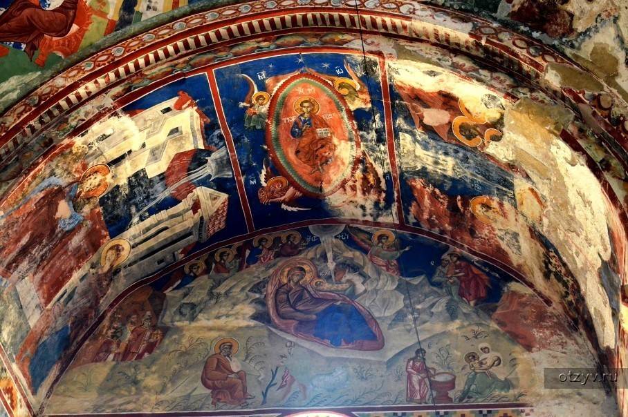 Справа на своде ведомые звездой волхвы (привязанные к деревьям кони – гордость Каппадокии), слева – ангелы и пастушок со свирелью.
