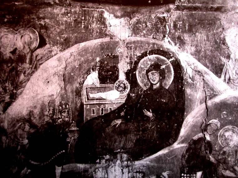 49. В церкви Спаса на Нередице (XII в., фреска, к огромному сожалению, тоже утрачена – сохранились только довоенные черно-белые фотографии) Богородица с молитвой обращается к Своему Новорожденному Сыну – так же, как на композиции в каппадокийской скальной церкви «Каранлик».