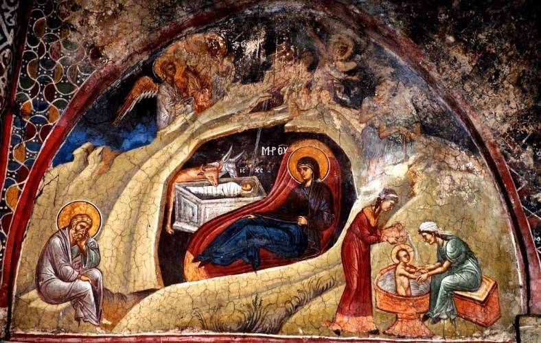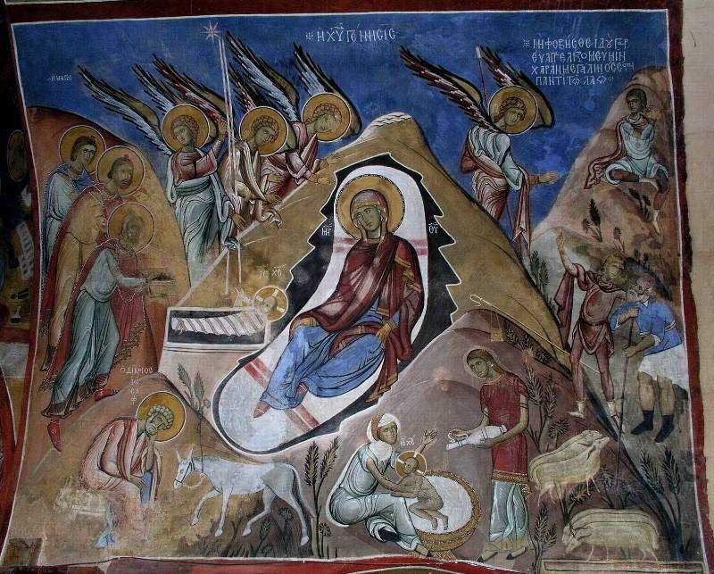 16. По счастливой случайности в апсиде каменного «сарая» сохранились фрески именно рождественского цикла. Все сцены пронизаны какой-то необычайной лиричностью, даже трепетностью. Кажется, все погружено в покой, и в то же время ощущается какое-то движение, некое веяние тихого теплого ветра (3 Цар. 19:8-12). На самом деле эта двойная подкладка – проступающее за изображенными на стене земными событиями сакральное действо – ощущается практически на каждой иконе Рождества. Но на этой – как-то особенно явственно. Здесь очень ощутимо звучит также торжественность, значимость события, которое повлияет на судьбы мира на много тысяч лет вперед, и таинственность, необычайность этой чудесной ночи.