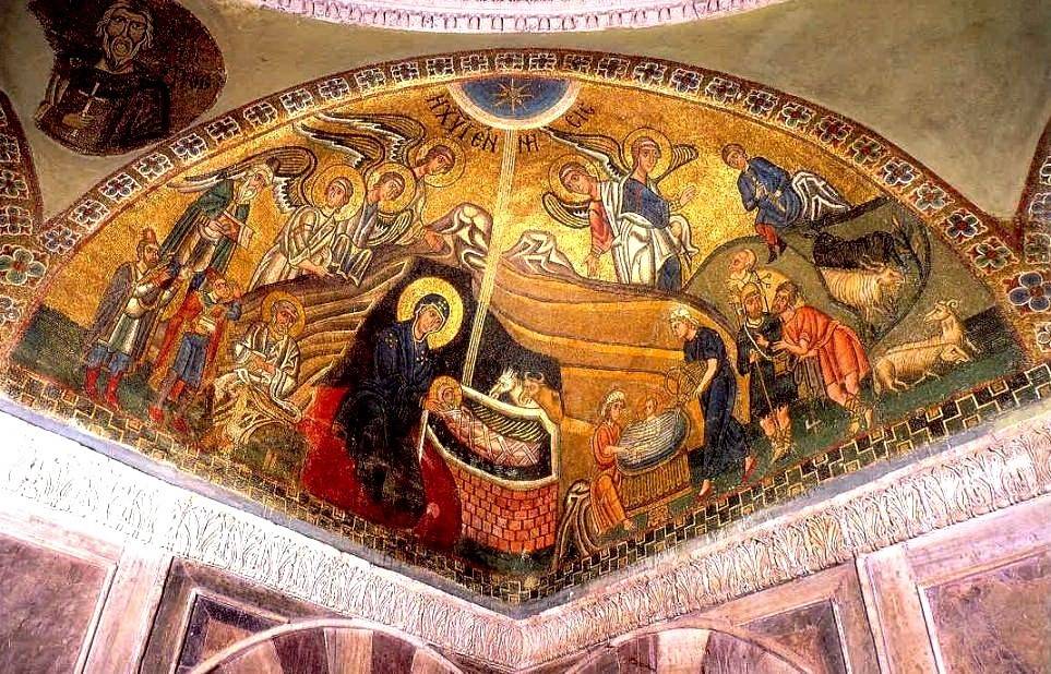 И закончим мы обзор раннехристианских икон Рождества самыми красивыми и грандиозными произведениями искусства в технике, известной еще с античных времен, но с победой христианства обретшей новое звучание. Это техника мозаики – искусство выкладывания живописных изображений из мелких камешков и кусочков стекла, которые не тускнеют от времени, но сохраняют свои первозданные цвета и блеск на протяжении веков и тысячелетий.