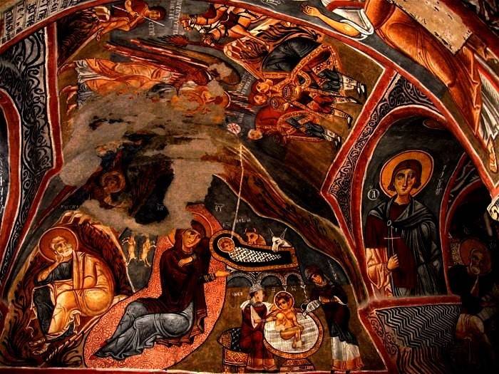 В Каппадокийской церкви, получившей турецкое именование «Каранлик килисе» («Тёмная» церковь, т.к. дневной свет в нее практически не проникает) среди росписей XI-XII вв. обращает на себя внимание очень интересное пространственное расположение композиций: на арке – пророки Исайя и Аввакум, рядом с ними их же осуществившееся пророчество – Рождество Спасителя-Мессии. Волхвы и ангелы с пастухами на другой стороне свода обращены к изображенной в люнете Богоматери с Младенцем, оттуда же, со свода, светит на Младенца звезда, за которой идут волхвы, – луч от нее идет через откос на поверхность люнеты, указывая прямо на Младенца.