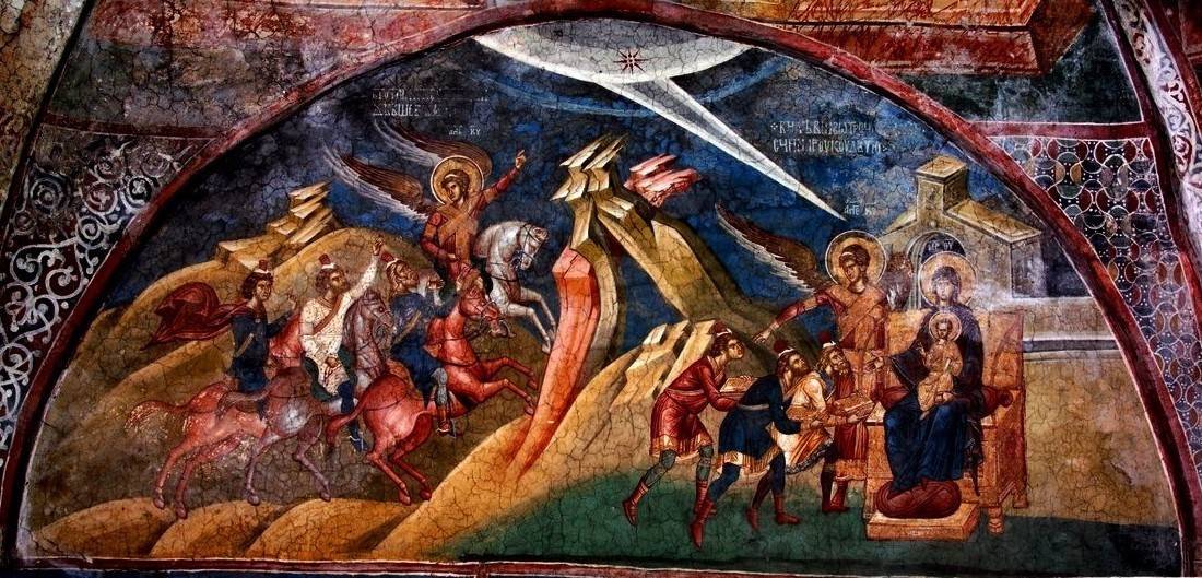 «И маги пошли, и вот звезда, которую они видели на Востоке, их вела, пока не вошла в пещеру. И маги увидели Младенца с Марией, Матерью Его, и поклонились Ему. И, вынув приношения из сумок своих, они поднесли Ему золото, ладан и мирру. И ангел известил их, что не надлежит им возвращаться к Ироду, и они другим путем отправились в страну свою».