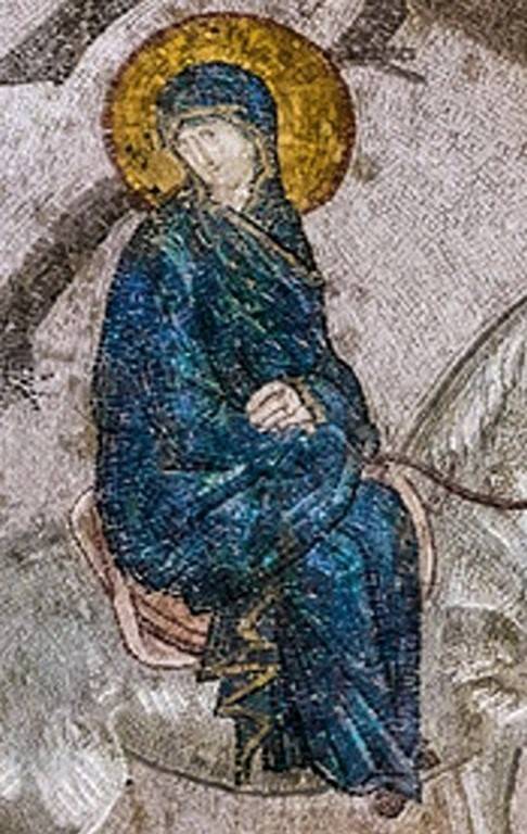 По сторонам трона – слева, вернее, по правую руку Богомладенца – Богородица Мария, Она же – символическое изображение Новозаветной Церкви, по левую – такое же олицетворение Церкви Ветхозаветной – она в синем покрывале и со свитком в левой руке, и на первый взгляд кажется, что это и есть Богородица, однако, это не так: Богородица здесь представлена как Царица – в золотом платье с белыми рукавами и с дорогими уборами. А изображение закутанной в синий мафорий женщины – это персонификация уходящей ветхозаветной Церкви. Правда, некоторые исследователи считают, что это праведная Анна, мать Богородицы Марии. Впрочем, одно другого не исключает, а, скорее, дополняет.