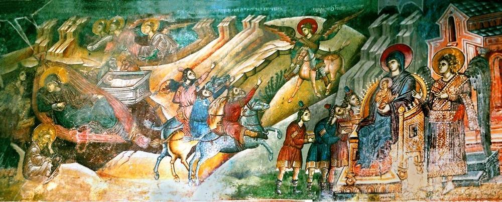 56. Сербия, Косово, собор Христа Пантократора монастыря Высокие Дечаны, роспись XIV в. Рождество Христово в цикле Акафиста Пресвятой Богородице (икос 4).