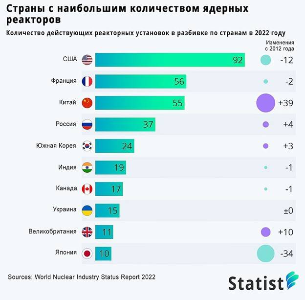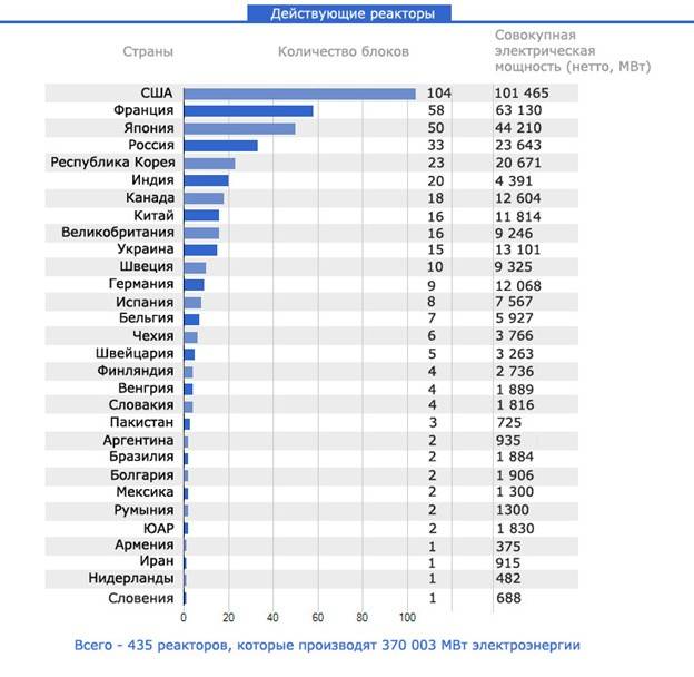 Как видим, самое большое количество реакторов у США, они дают примерно 25% всей электроэнергии страны. А значит, именно Америке нужно больше всех топлива для АЭС.