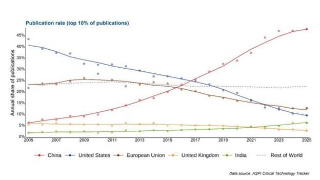 Согласно данным ASPI Critical Technology Tracker за 2025 год, Китай занимает первое место в 66 из 74 критически важных и перспективных технологических направлений. США лидируют лишь в восьми областях.