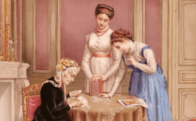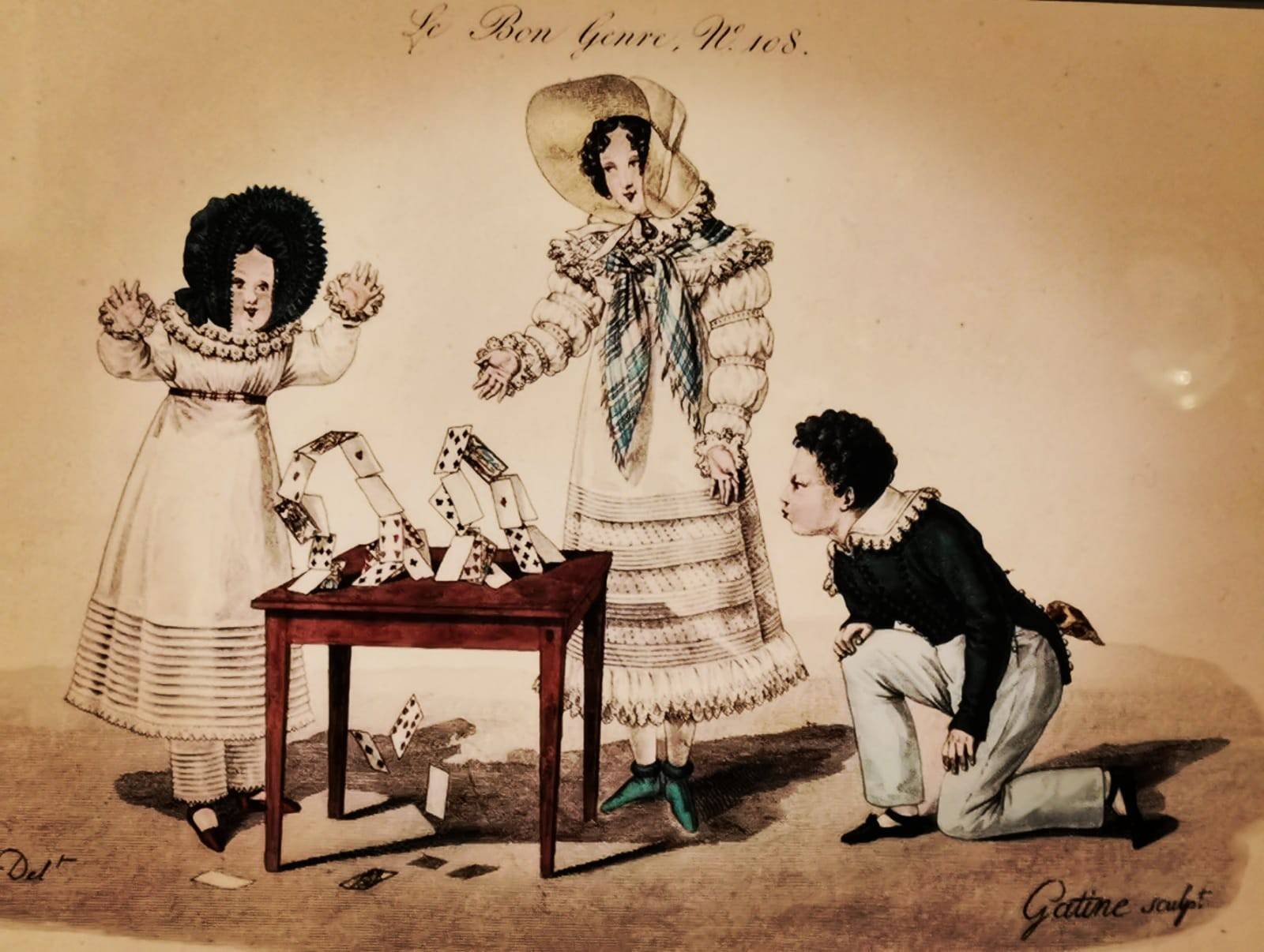 Существовала мода не только на платья и меблировку, но также и на игры. В обиход входили то одни, то другие. Иван Тургенев в романе «Новь» делает подробный отчёт занятий старомодных господ: «Потом супруги Субочевы опять что-нибудь читали, или пересмеивались с карлицей Пуфкой, или пели вдвоем старинные романсы… или, наконец, играли в карты, но тоже все в старинные игры: в кребс, в ламуш или даже в бостон сампрандер!» Вообще, эта выставка – отличное дополнение к школьной программе. Ученик созерцает то, что в книге кажется банальным отображением ушедших эпох. Лучше один раз постоять рядом с ломберным столом и рассмотреть рисунки для карт, чем сто раз написать сочинение о нравах помещиков.
