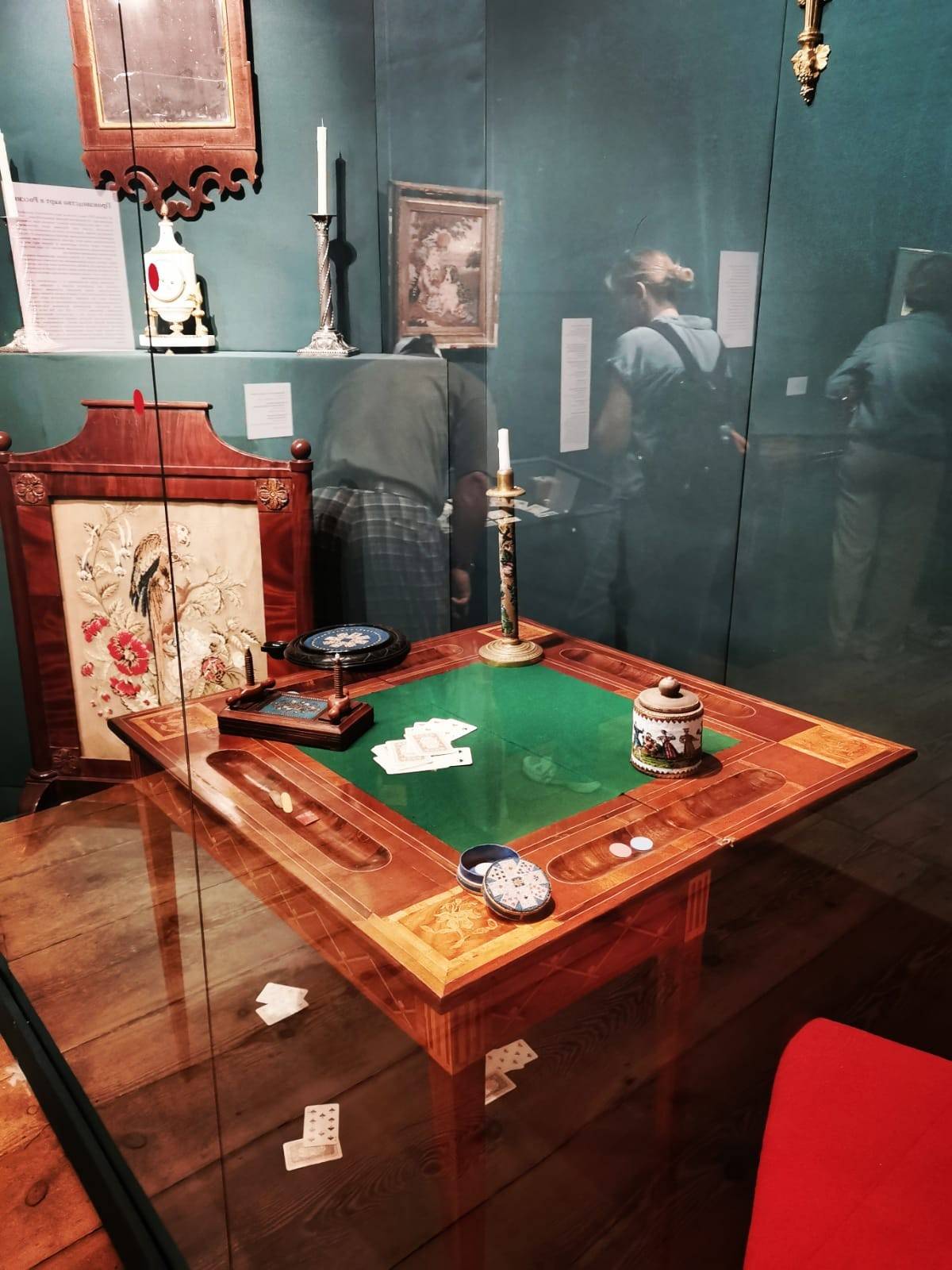 В застеклённой выставочной витрине реконструирован кабинетик этакого повесы – стол с зелёным сукном, подсвечник, каминная ширма, курительный чубук, а ещё мелки для записывания выигрышей и щёточка, чтобы всё это стирать, когда всё закончено. И да – карты, валяющиеся под столом. Дескать, талья завершилась. К слову, футлярчики для мелков и щёток часто оформлялись бисером, что мы и наблюдаем в экспозиции.