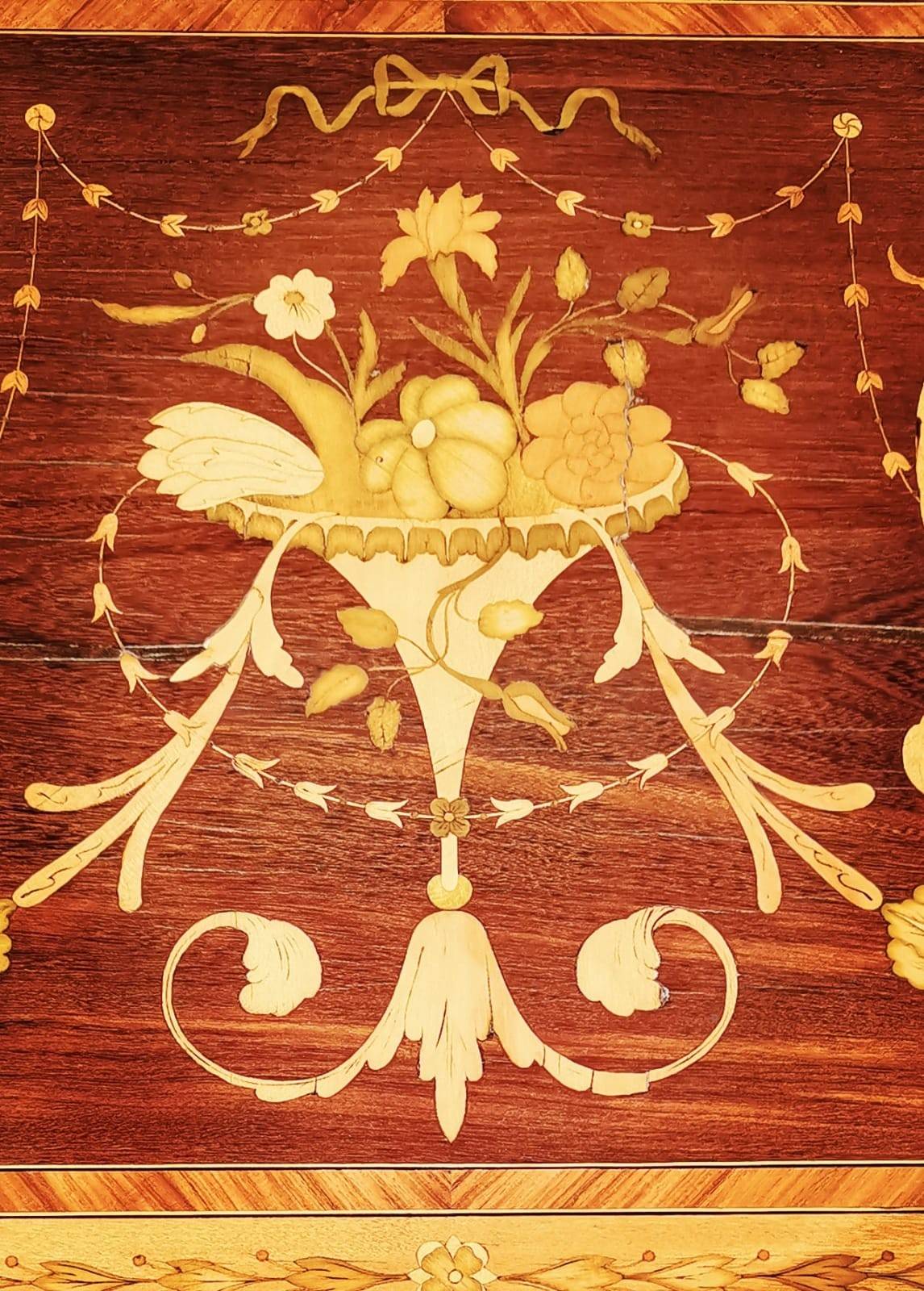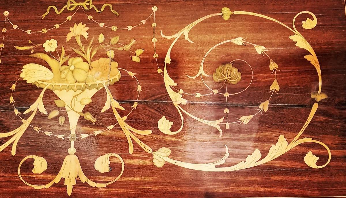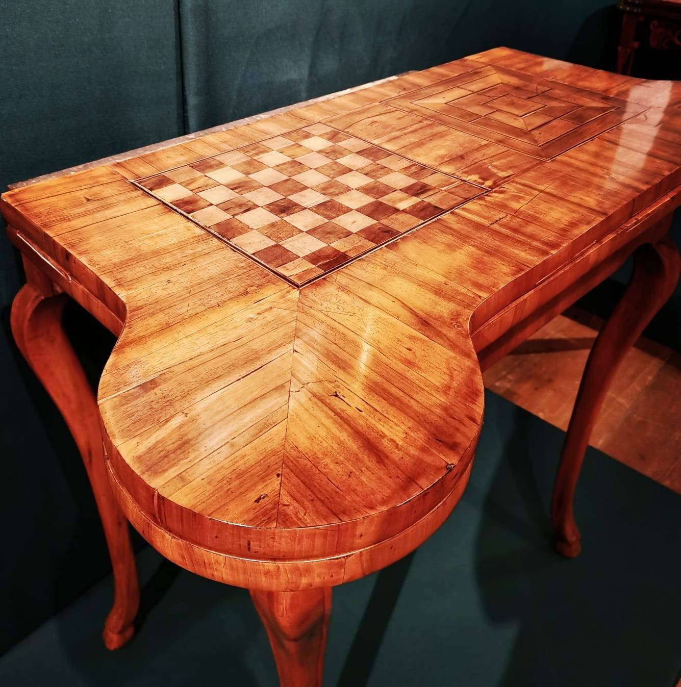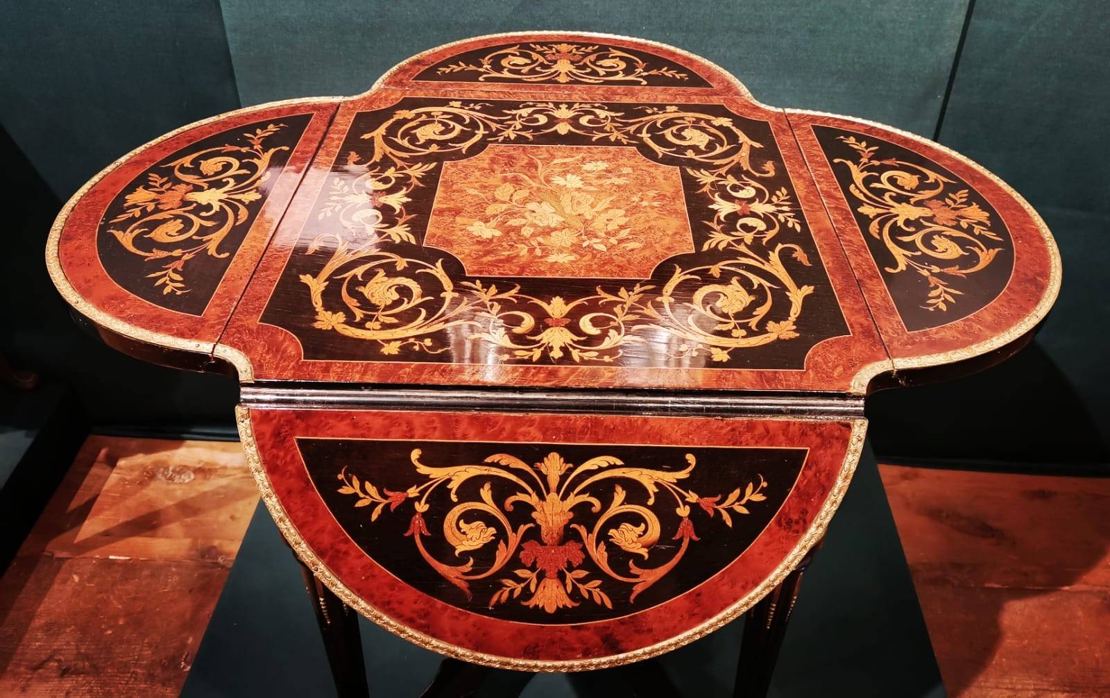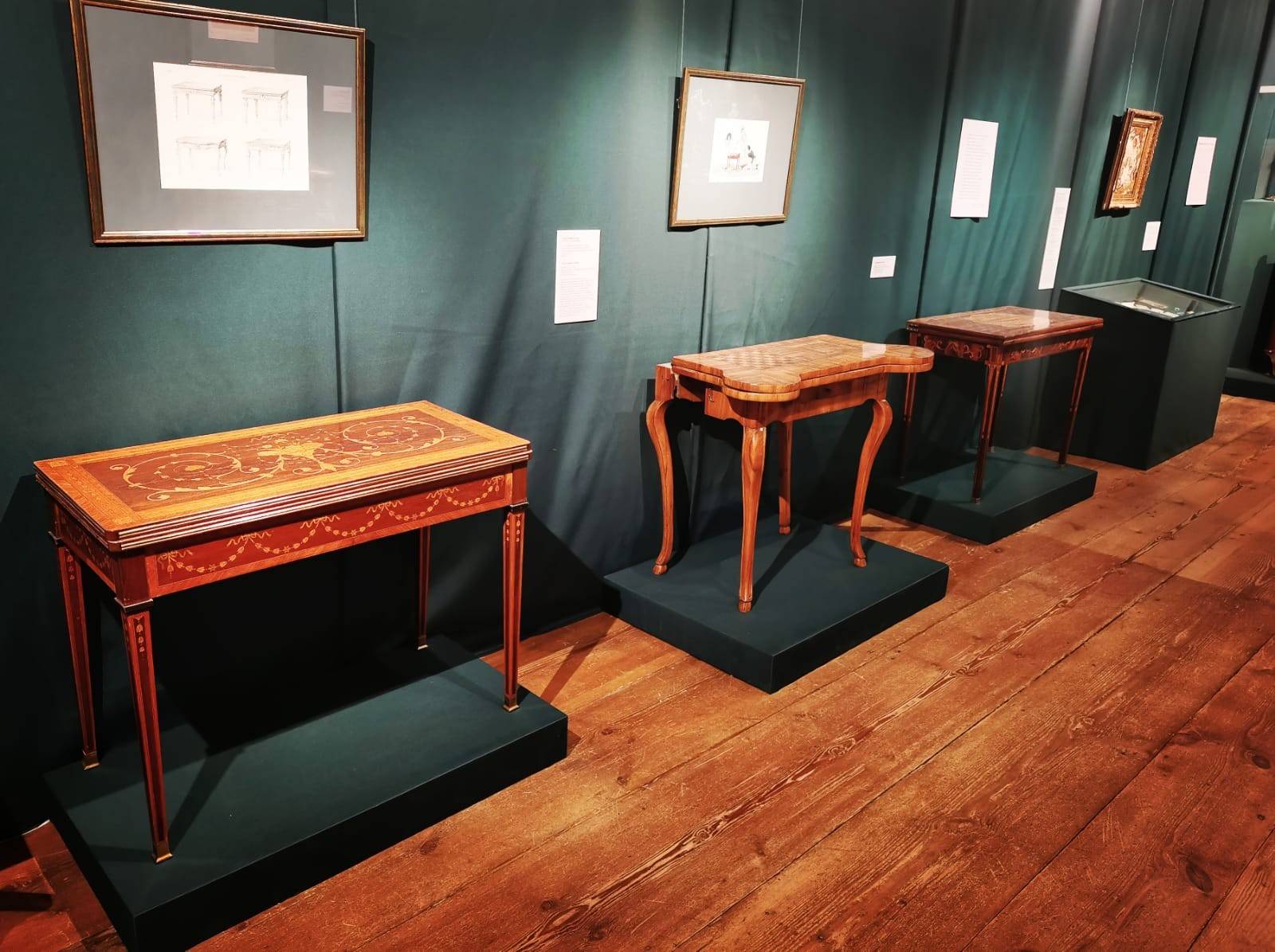 Ломберные столы бывали двух видов – с зелёным сукном или без оного. В экспозиции представлены обе версии, но предпочтение отдано гладким поверхностям, выполненным в технике маркетри. Вот – роскошный образец Галантного столетия. Исследователи связывают этот ломберный стол с кругом известного петербургского мастера Христиана Мейера, работавшего по заказам императорского Двора и владевшего крупной петербургской мастерской в последней четверти ХVIII века. Столешница оформлена виньетками, поддерживающими рог изобилия, фонтанирующего не фруктами, но цветами.
