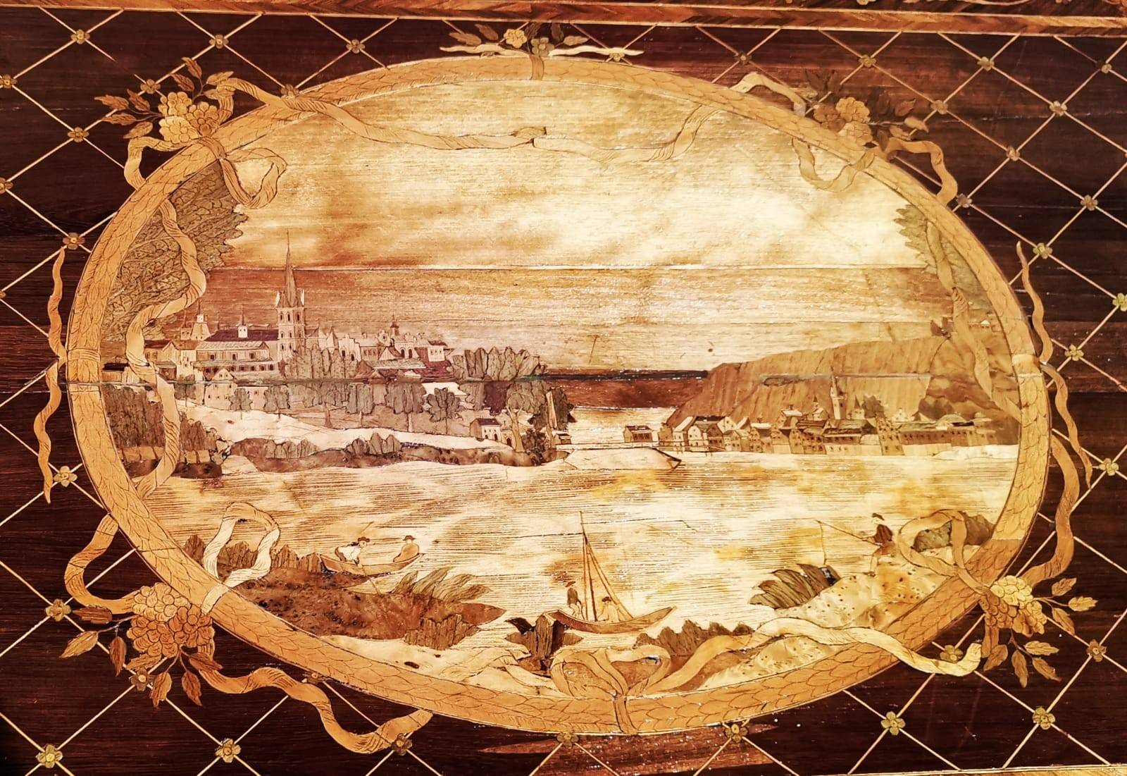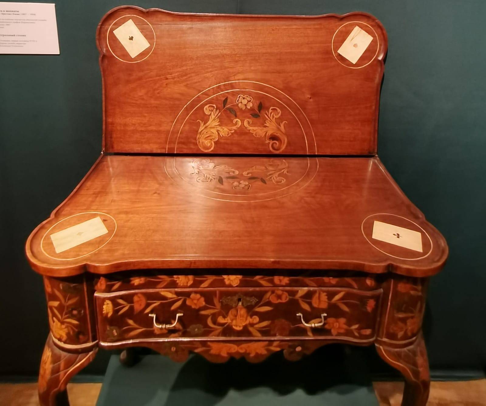 Рядом – столик с «аппликацией», изображающей город – это также русская вещь, созданная на рубеже столетий. Имеются голландские и французские образцы из коллекций Кусково и Останкино. Хотя экспонатов не так много, но всё же по ним легко отследить, как вычурное рококо сменялось лапидарно-величественным ампиром, а после него расцветал прихотливый бидермейер.