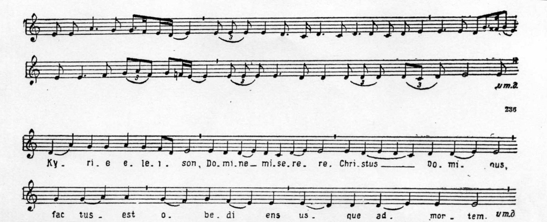 Предвижу возражения: но Идельсон записывал современные ему синагогальные напевы. Да, на них распевались слова, далёкие от депрессии (например, тексты из Библии, из книги Исход). Но это – традиция иудеев начала ХХ века. А такой ли она была в древности? Но исследователь сравнил эти поздние напевы с грегорианским хоралом, читаемым, как известно, с XI века. И… нашёл массу параллелей! Вот одна из них – на иудейский напев как раз пелись слова из Исхода (приводится по: Грубер Р. И. История музыкальной культуры. М.-Л., 1941, т. 1, ч. 1, с. 257):