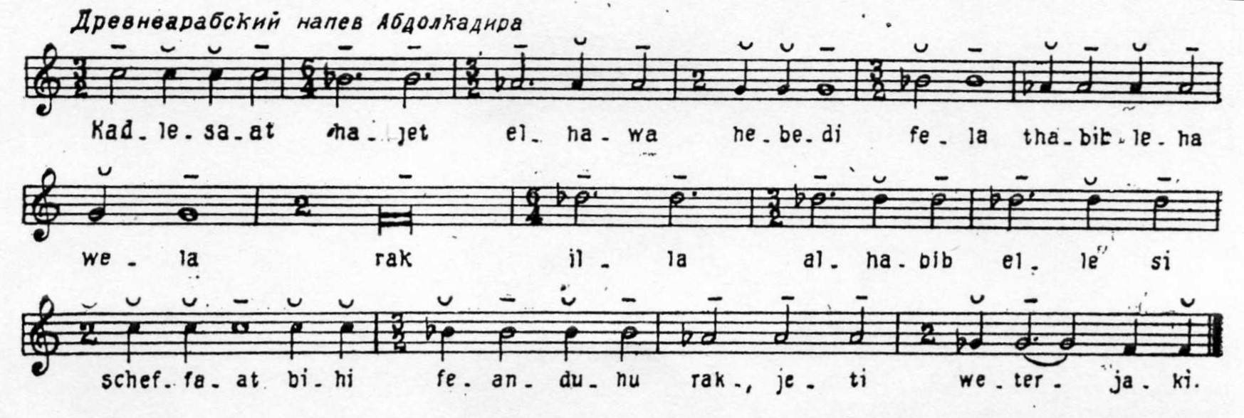 А как же обстояло дело с музыкой иных семитских народов? На сей случай можем посмотреть, например, редкие записи арабских музыкальных теоретиков XIII – XIV вв. Среди них выделяется прочитанный бароном д'Эрланже напев Абдул-Кадыра по записи XIV века (Грубер, с. 454):
