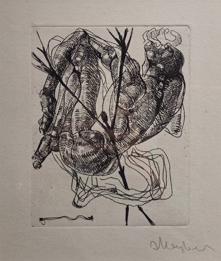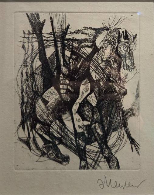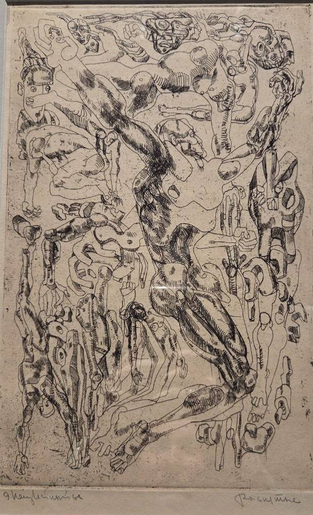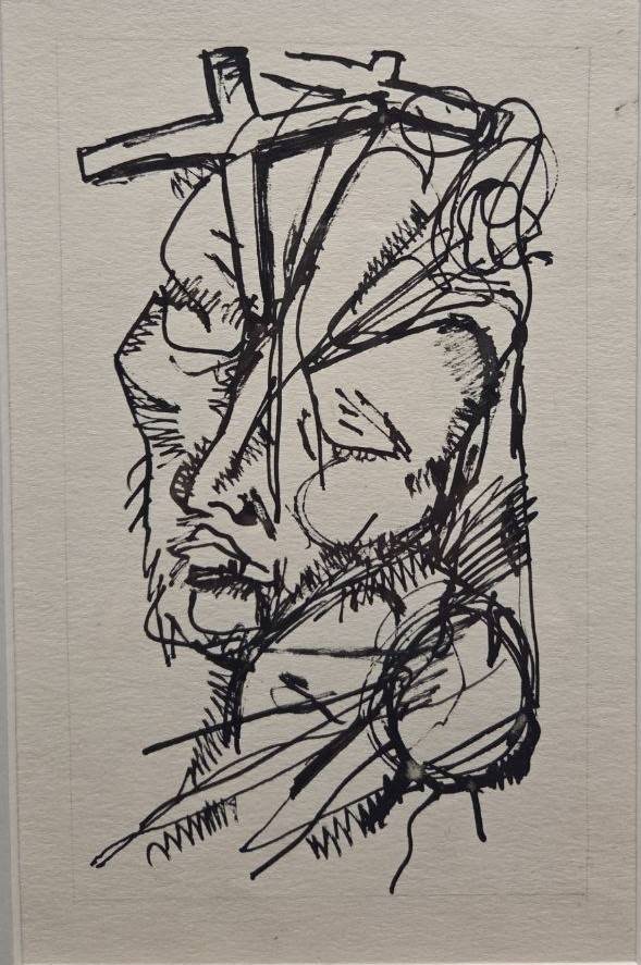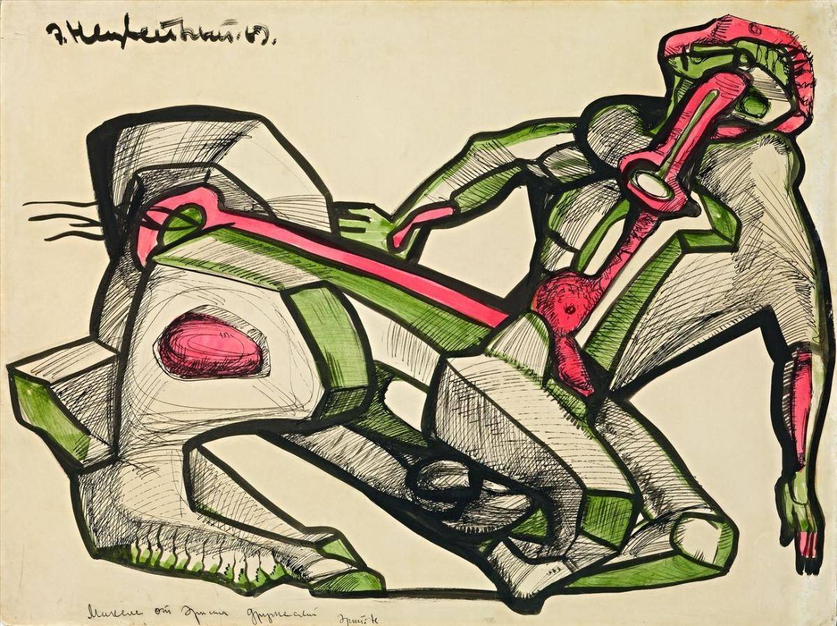 Многие работы Неизвестного – это попытка вырваться из тенет, причём тенета – это не столько советская действительность, как часто пытаются вообразить, сколько – рефлексия и поиск целого, изначального, неделимого. Композиция «Два лица» - ощущение личной двойственности, где сознание борется с подсознанием и, как справедливо отметил Никита Хрущёв, идёт битва ангела с демоном. На одном из рисунков – некто, чью голову раскалывает крест. «Ядерный взрыв» - снова разрывание на части и безмолвное рыдание, кое никто не услышит. Многоликость-раздвоенность возникает в работе «Пантеизм», где автор обращается к языческой праистории, когда боги бывали капризны и поворачивались то ясным ликом, то – злобным, как стихийное бедствие. «Тотем» - ещё одна вещь, погружающая в запредельную архаику. Не вполне ясно, что за животное выступило в тотемическом качестве, ибо предъявлен череп с пустыми глазницами.