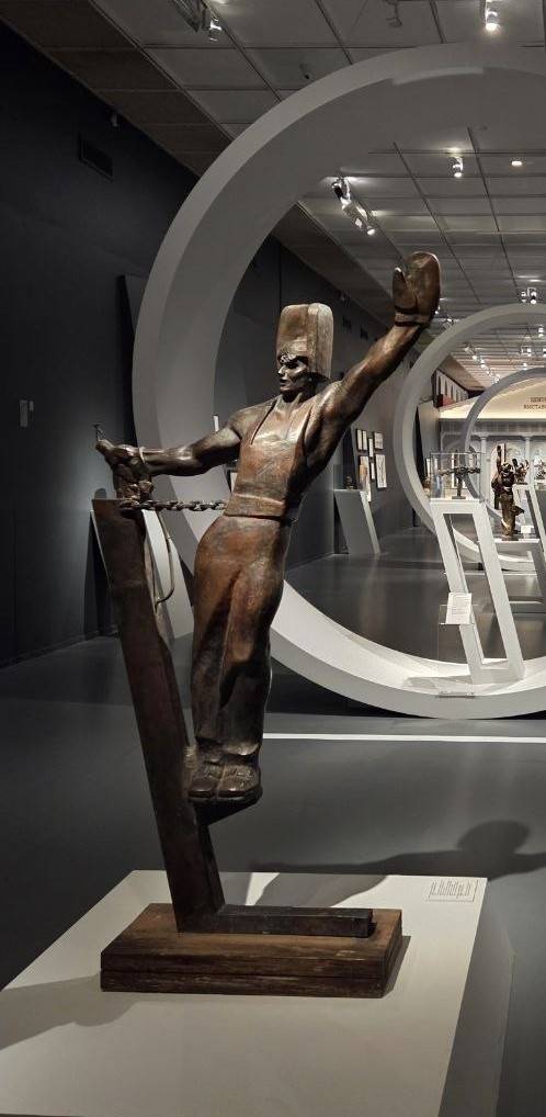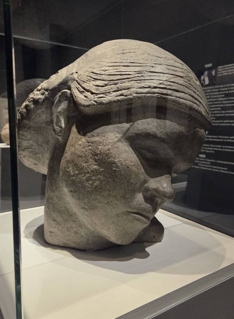 Один и центральных экспонатов - гипсовая модель памятника. Голова Хрущёва словно бы зажата меж светом и мглой. Деятель, наломавший дров чуть не во всех отраслях, тем не менее, стал лидером в космической гонке и поспособствовал расселению коммунальных квартир, полуподвалов, домов барачного типа. Любой советский лидер достоин, если не славословия, то хотя бы правды. «В этой работе будет и моё отношение к Хрущеву, как к дуалистической фигуре, стоящей на границе двух времен, как фигуре, содержавшей в себе реальные противоречия», - рассуждал Неизвестный. Мастер углядел эту сложность хрущёвской натуры, а в полемике Художника с Властью последнее слово осталось именно за Художником.