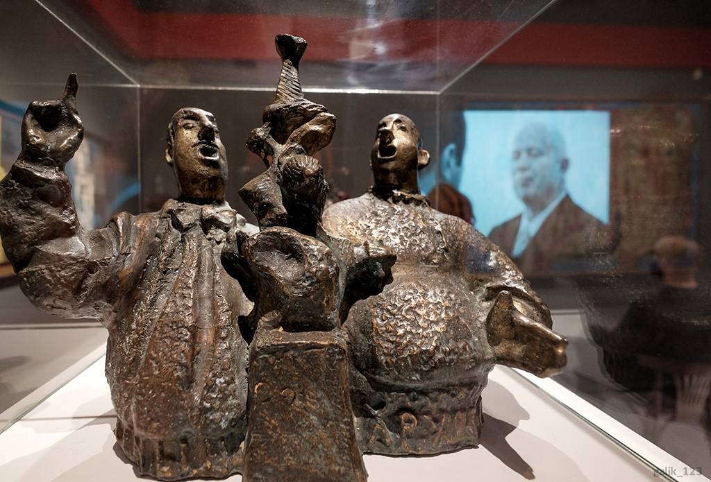 Толковать о Неизвестном и обойти вниманием ту выставку в Манеже-62 – не получится. Хамоватый, но прямолинейный Никита Хрущёв устроил тогда настоящее шоу – примерно так же себя ведут акционисты, страждущие новых форм самовыражения. Акционизм возник в 1960-х, поэтому царь Никита попал в тренды. Хрущевский перформанс либералы называют «погромом», однако, там имел место диалог. Глава государства не просто кричал да обзывался – он слушал аргументы. Неизвестный отмечал: «Разговаривая с Хрущевым, я ощущал, что динамизм его личности соответствовал моему динамизму, и мне, несмотря на ужас, который царил в атмосфере, разговаривать с ним было легко, это был разговор, адекватный моему внутреннему ритму». Замечателен и финал диалога: «Кончилась наша беседа с Хрущевым следующим образом. Он сказал: "Вы интересный человек, такие люди мне нравятся, но в вас одновременно сидят ангел и дьявол. Если победит дьявол, мы вас уничтожим. Если победит ангел, то мы вам поможем". И он подал мне руку». Из Хрущёва постоянно лепят какого-то идиота, колотящего ботинком по трибуне, а вот скульптор-интеллектуал видел его со своих колоколен. Потому-то и согласился ваять надгробие своего идейного антагониста. Среди экспонатов - забавная скульптура Владимира Лемпорта «Диспут Эрнста Неизвестного с Никитой Хрущёвым», сделанная в начале 1960-х. Это – комические герои, оба пузаты и карикатурны.