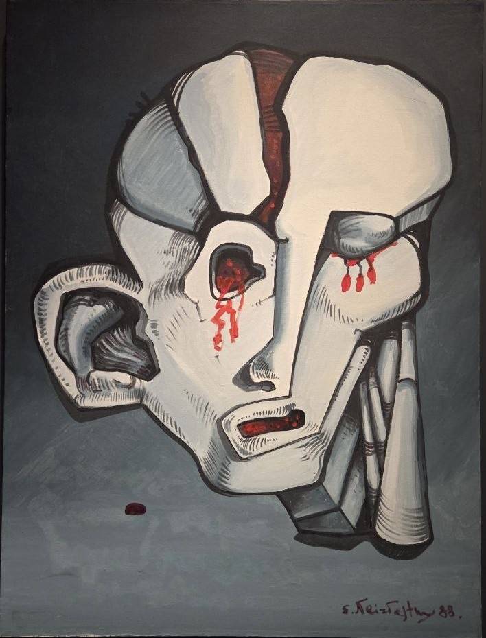 На рисунке из серии «Судьба художника» - скорчившийся мужчина, которого ничто не держит в такой жуткой позе, но он не в состоянии развернуться. Неслучайно и обращение к «Божественной комедии» Данте Алигьери – идеально выражена преисподняя, где всё обречено к раздроблению и давлению. На полотне «Сад душ» - бесконечные голгофы, и акриловая яркость лишь добавляет ужаса этой картине. «Смятение» - это перепутье и незнание, куда идти. Крепкая ручища указывает в одну сторону, а цель – она, возможно, в другом месте. «Проходящий сквозь стену» - что это, как не попытка эскапизма? Уничтожить преграду оказывается легче, нежели с чем-то смириться – он не похож на «проходящего», мы видим одолевающего. «Бегун в ленте Мёбиуса» - неужели своеобразный автопортрет, где человечек мается внутри злой бесконечности? На ряде тщательно проработанных рисунков (без названия) явлена голова с гигантской трещиной, а из глаз вытекает кровища. Целостен лишь Фёдор Достоевский – его портрет напоминает идола, стойкого и бескомпромиссного.