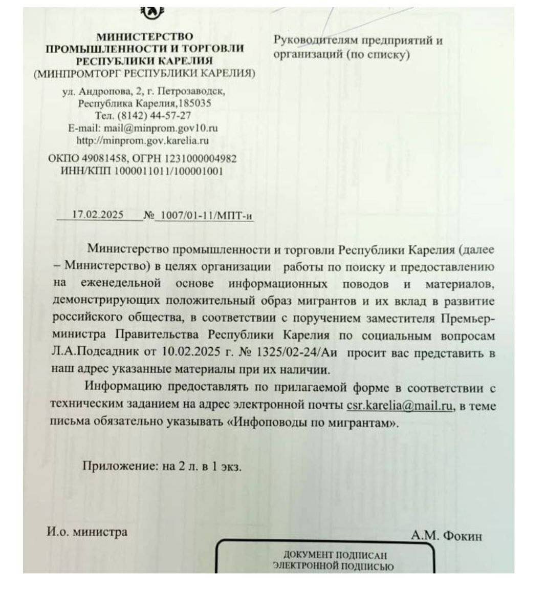 Первый, датированный 17 февраля 2025 года и подписанный исполняющим министра Антоном Фокиным, адресован «Руководителям организаций и предприятий (по списку)»: «Министерство торговли и промышленности Республики Карелия в целях организации работы по поиску и предоставлению на еженедельной основе поводов и материалов, демонстрирующих положительный образ мигрантов и их вклад в развитие российского общества, в соответствие с поручением заместителя Премьер-министра Республики Карелия по социальным вопросам Л.А.Посадник от 10.02.2025 г. №1325/02-04/Аи просит вас предоставить в наш адрес указанные материалы при их наличии. Информацию предоставлять по прилагаемой форме в соответствие с техническим заданием на адрес электронной почты crs.karelia@mail.ru, в теме письма обязательно указывать "Информповоды по мигрантам"».
