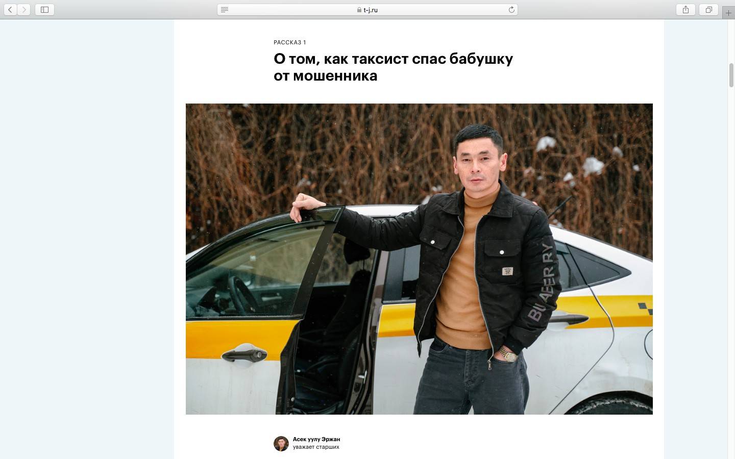 26 декабря 2024 года на «Т-Ж» выходит публикация журналистки Марии Пассер, в которой прямо в заголовке и подзаголовке навязчиво и топорно повторяется описанное выше ТЗ: «Как таксисты-мигранты помогали своим пассажирам в России: Спасали от мошенников и защищали от грабителей». И дальше в подзаголовке: «Трое таксистов из Кыргызстана, которые работают в Москве, поделились, как пришли на выручку своим пассажирам. Публикуем их истории о том, как они спасали бабушку от мошенников и девушку от грабителей и помогали принять роды у пассажирки». По странной такой случайности, все три описанных в статье таксиста – киргизы.