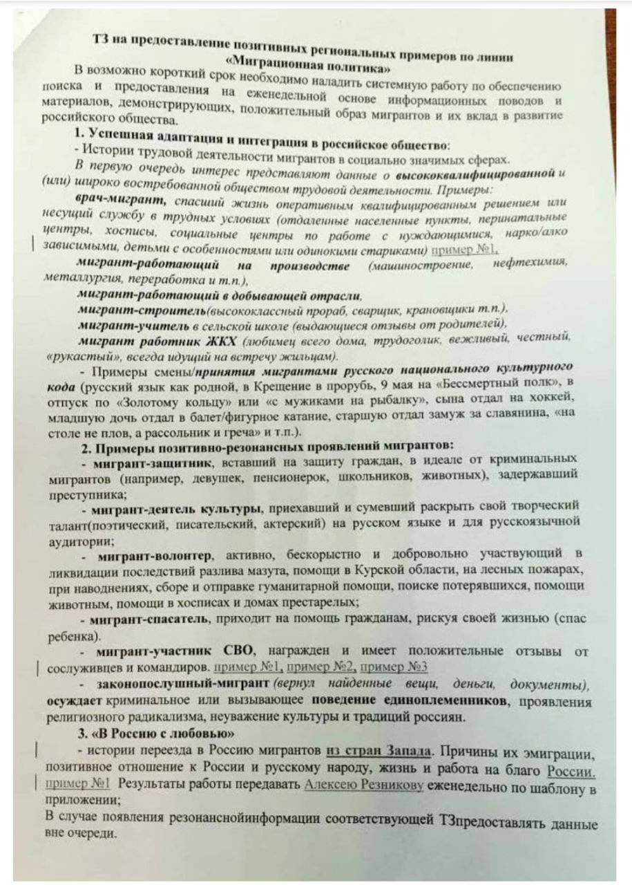 Второй документ без шапки и подписи, озаглавлен «ТЗ на предоставление позитивных региональных информационных примеров по линии "Миграционная политика"» (возможно, это упомянутое в первом документе техническое задание, вынесенное в упомянутое там же приложение): «В возможно короткий срок необходимо наладить системную работу поиска и предоставления на еженедельной основе информационных поводов и материалов, демонстрирующих положительный образ мигрантов и их вклад в развитие российского общества… Результаты работы передавать Алексею Резникову еженедельно и по шаблону».