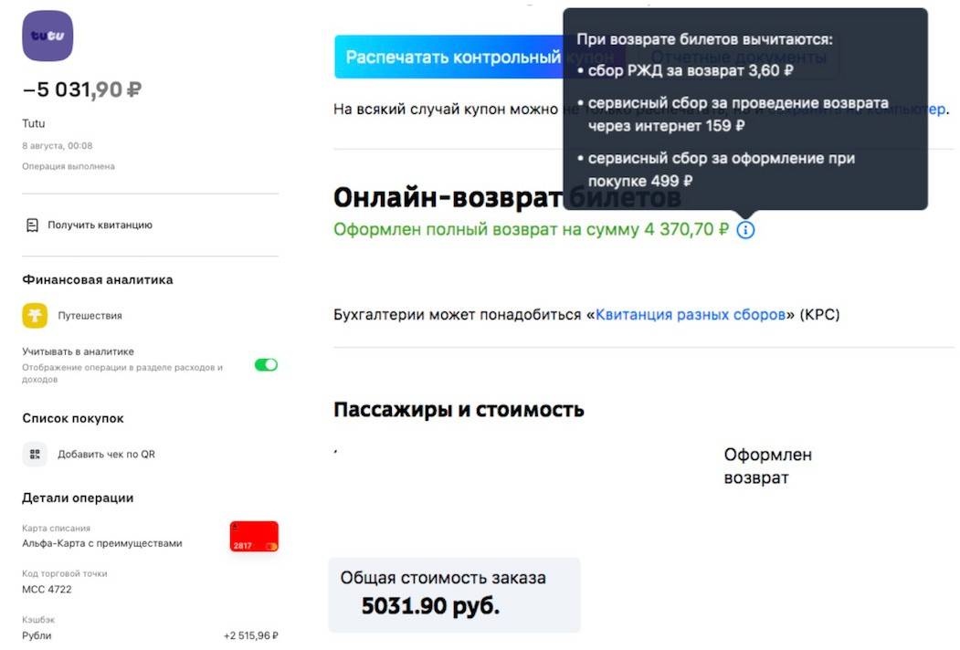 Другая стратегия у Альфа-банка – там в рамках «Альфа-Пятницы» периодически бывают акции с кэшбэком 50% у определенных партнёров в определенные дни (причем, что удобно, в Альфа-банке об этой акции известно заранее всю неделю, тогда как в Т-банке известно становится только в этот же день). Например, в ноябре 2025 года такая акция у Альфа-банка была с Авито, а в августе – с сервисом Tutu.ru. Таким образом, я взял билет на поезд за 5032 руб и получил кэшбэк 2516 руб. Правда, ближе к дате поездки из-за пересечения графиков с работой билет мне пришлось сдать. И тут выяснился неприятный момент – Tutu.ru берет весьма ощутимые сервисные сборы за оформление (при покупке билета 499 руб и при проведении возврата 159 руб), которые при сдаче билета вычитает из оплаченной суммы. Такие особенности сервиса надо иметь в виду.