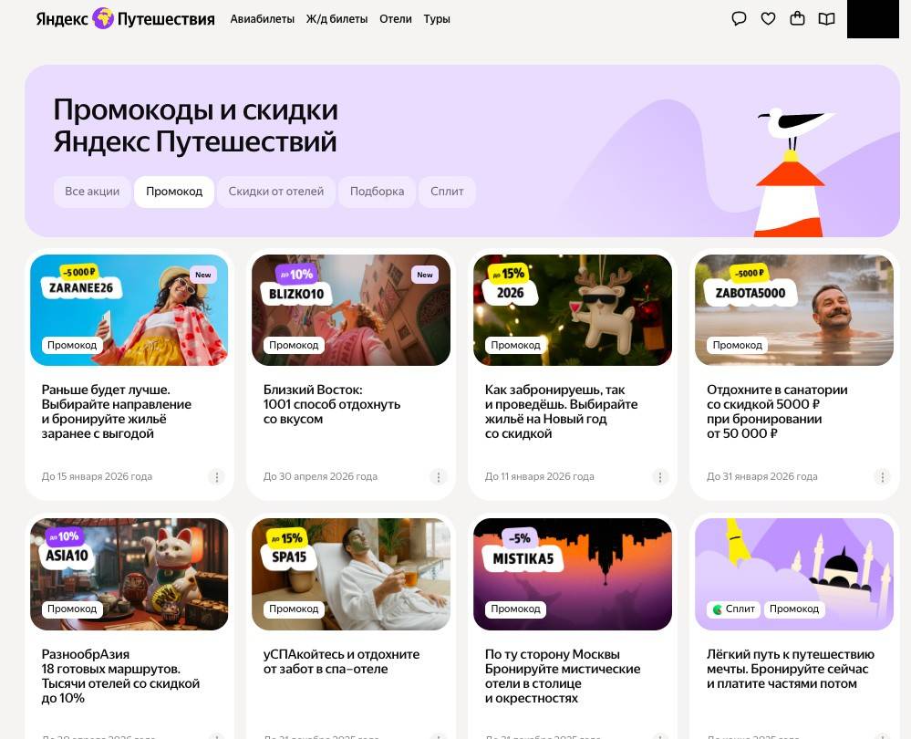 Пятое правило – проверять спецпредложения агрегаторов и банков. Например, Otello (сервис бронирования от 2ГИС) или Яндекс.Путешествия постоянно предлагают промокоды на скидку до 10 – 15%, а летом 2025 годы промокоды во втором сервисе позволяли скинуть до 20 – 25% от стоимости бронирования. Плюс, также можно оплатить до 99% стоимости бонусами СберСпасибо (в Otello) или Баллами Плюса в Яндекс.Путешествиях. За счёт возможности потратить эти бесполезные за пределами экосистемы «фантики», кстати, Яндекс.Путешествия популярны у многих туристов.