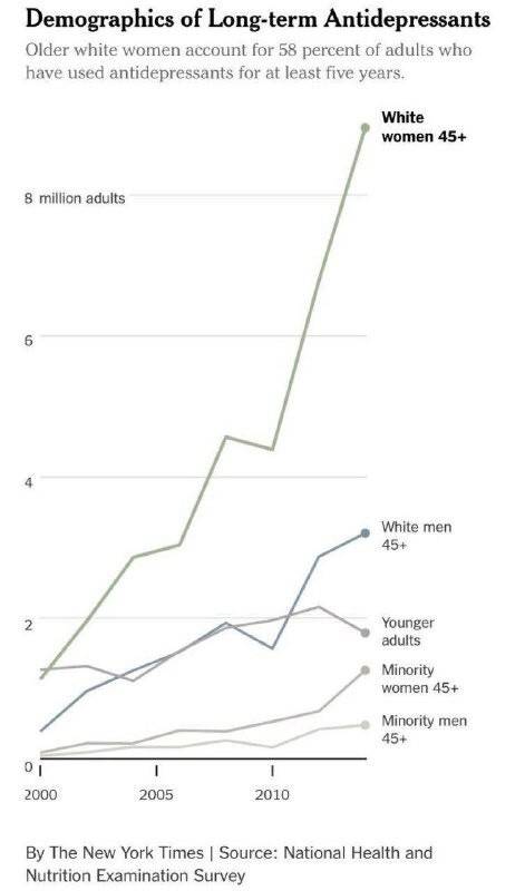Белые женщины 45+ составляют 58% от всех постоянных (от 5 лет и дольше) взрослых потребителей антидепрессантов в США. На втором месте с большим отрывом белые мужчины 45+. У женщин чудовищный скачок с 2010 года.