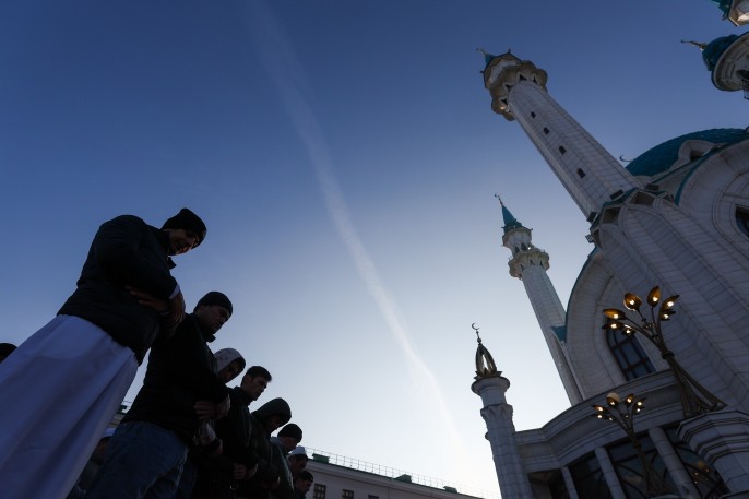 Фото: Егор Алеев/ТАСС. Верующие во время намаза у мечети Кул-Шариф в день праздника Ураза-байрам.