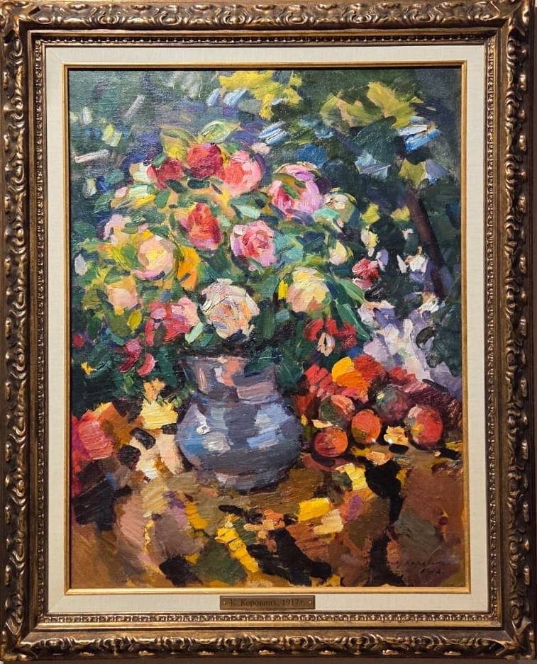 Уже афиша даёт нам понять, что основное внимание будет обращено к Константину Коровину и его дивным соцветьям и созвучьям. Он видел мир интенсивным, сочным, густым. «Бревна от земли шли в жёлтых, оранжевых рефлексах. Цвета горели невероятной силой, почти белые. Под крышей, в крыльце, были тени красноватые с ультрамарином. И зелёные травы на земле горели так, что не знал, чем их взять», - писал он в своих мемуарах.
