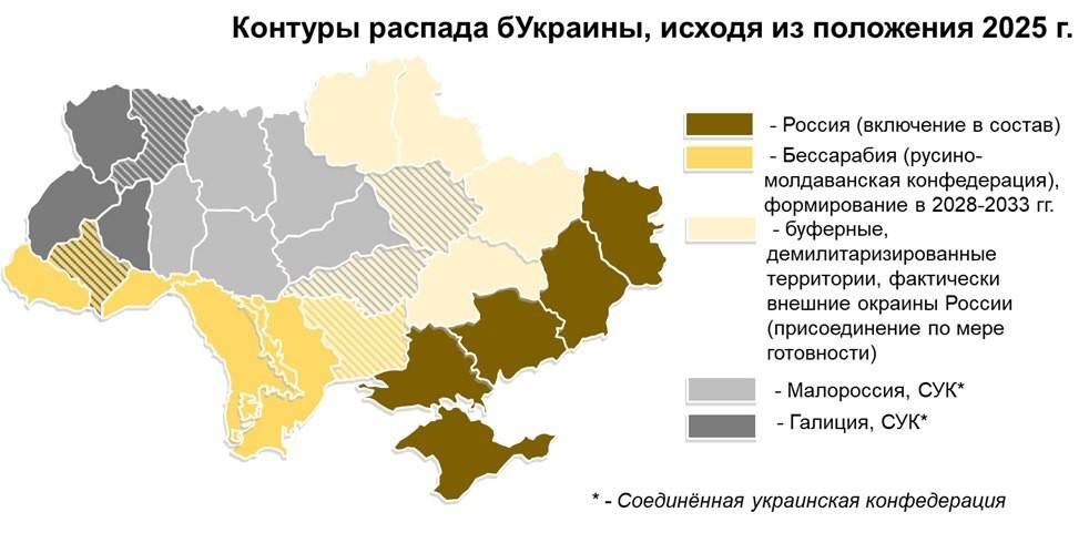 В настоящее время описание будущего Украины через распад по культурно-историческим границам на Новороссию в широком смысле (русскоязычные регионы), Галицию и Малороссию утратило актуальность. Исходя из общемировых трендов, все территории бУкраины окажутся в зоне влияния России, а в 2028–2030 гг. пойдёт экспансия на запад, после фрагментации, гибели институтов ЕС и ухода США / НАТО. Будущее включённых в состав России регионов обсуждению не подлежит.
